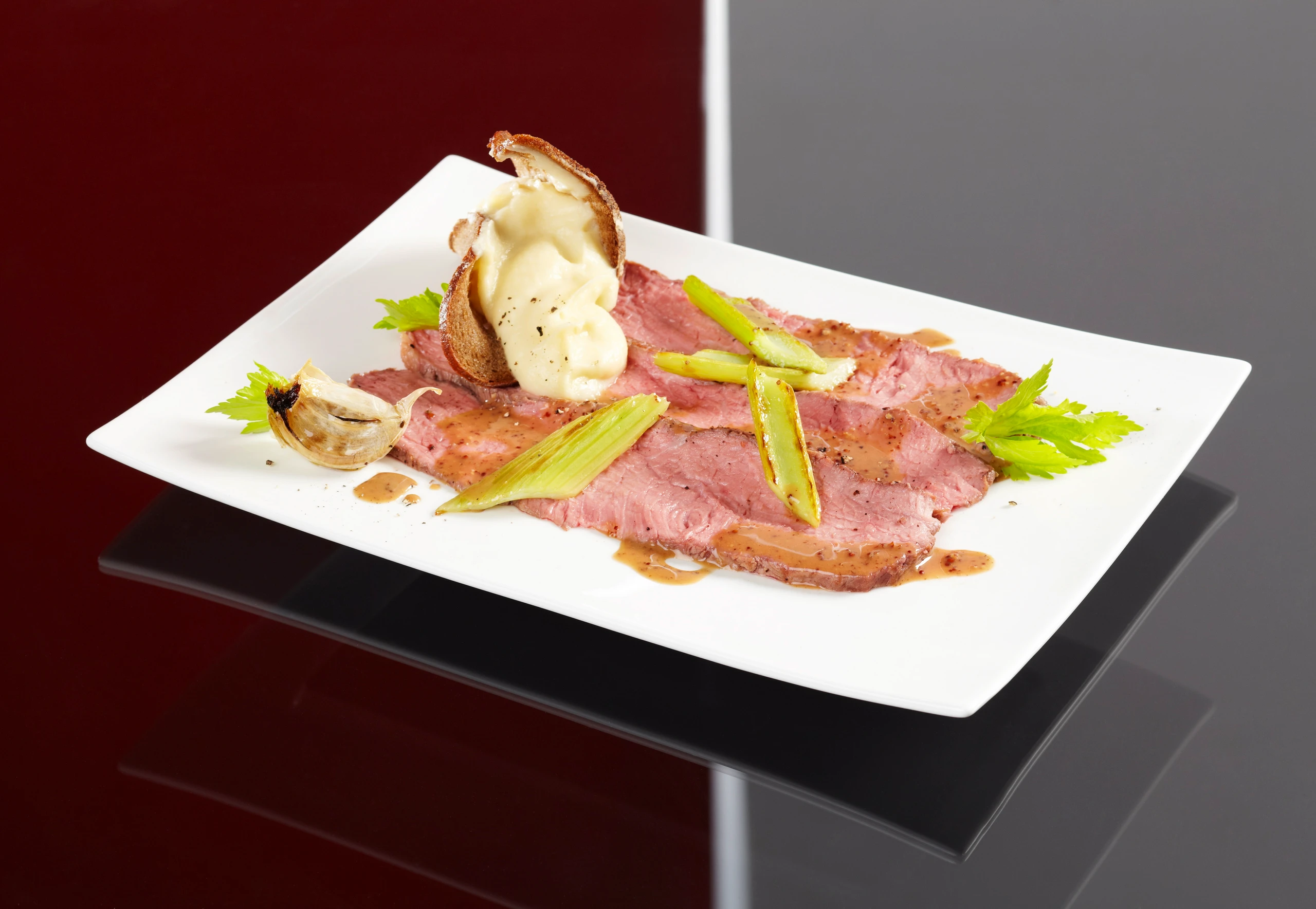 - Fond mit übrigemObers vermischen und aufkochen, Senf einrühren. Fleisch aus der Pfanne nehmen, kurz rasten lassen und in dünne Scheiben schneiden. Brot mit Püree füllen. Fleisch mit Sauce, Stangensellerie und Püree anrichten.