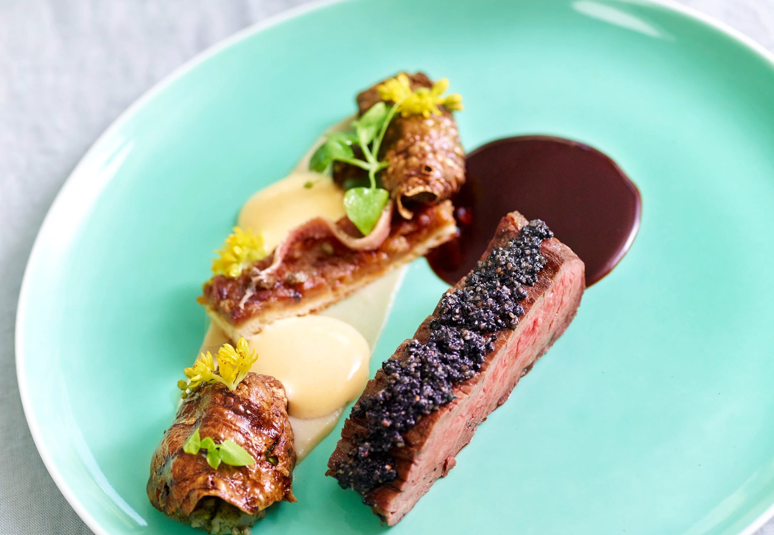 Beiried mit Sesam, Heu-Hollandaise und Topinambur