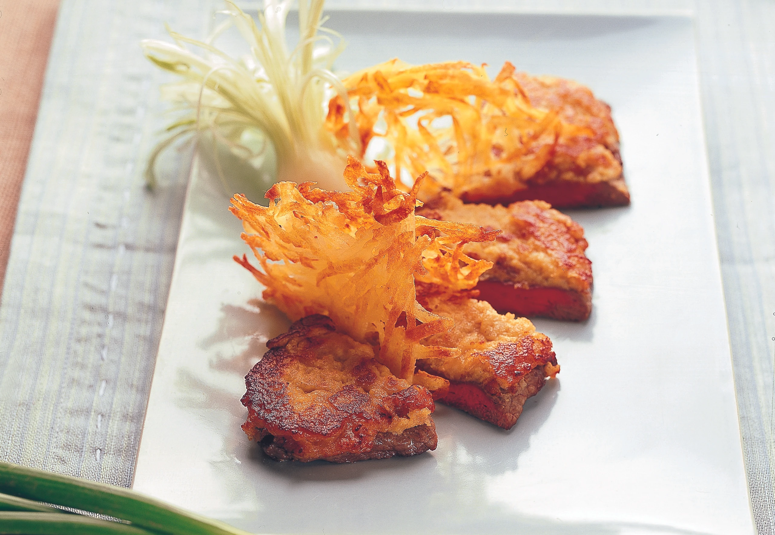 Beiriedschnitzel mit Zwiebel-Senfkruste