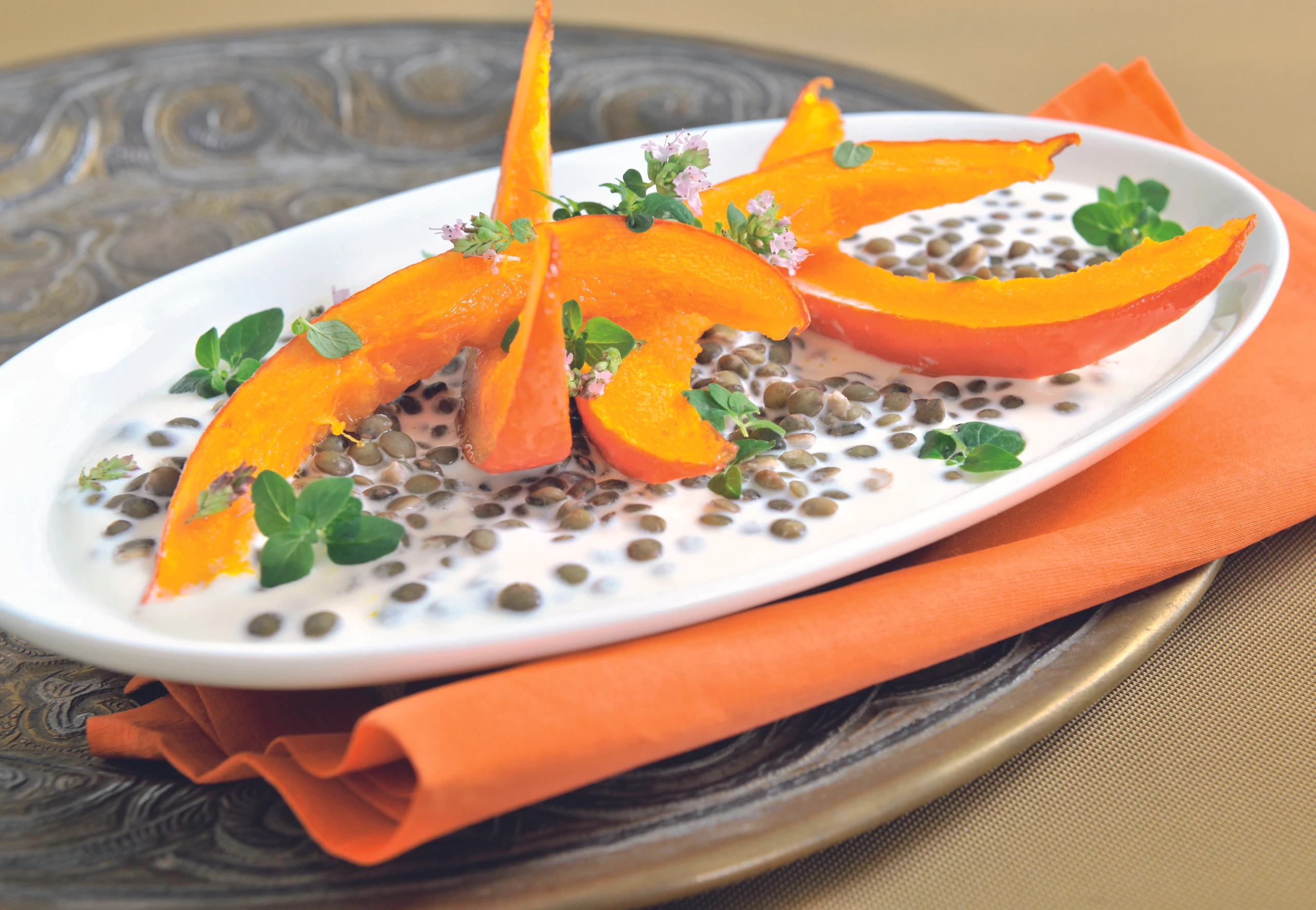 Berglinsen mit Ziegenfrischkäse und Kürbis
