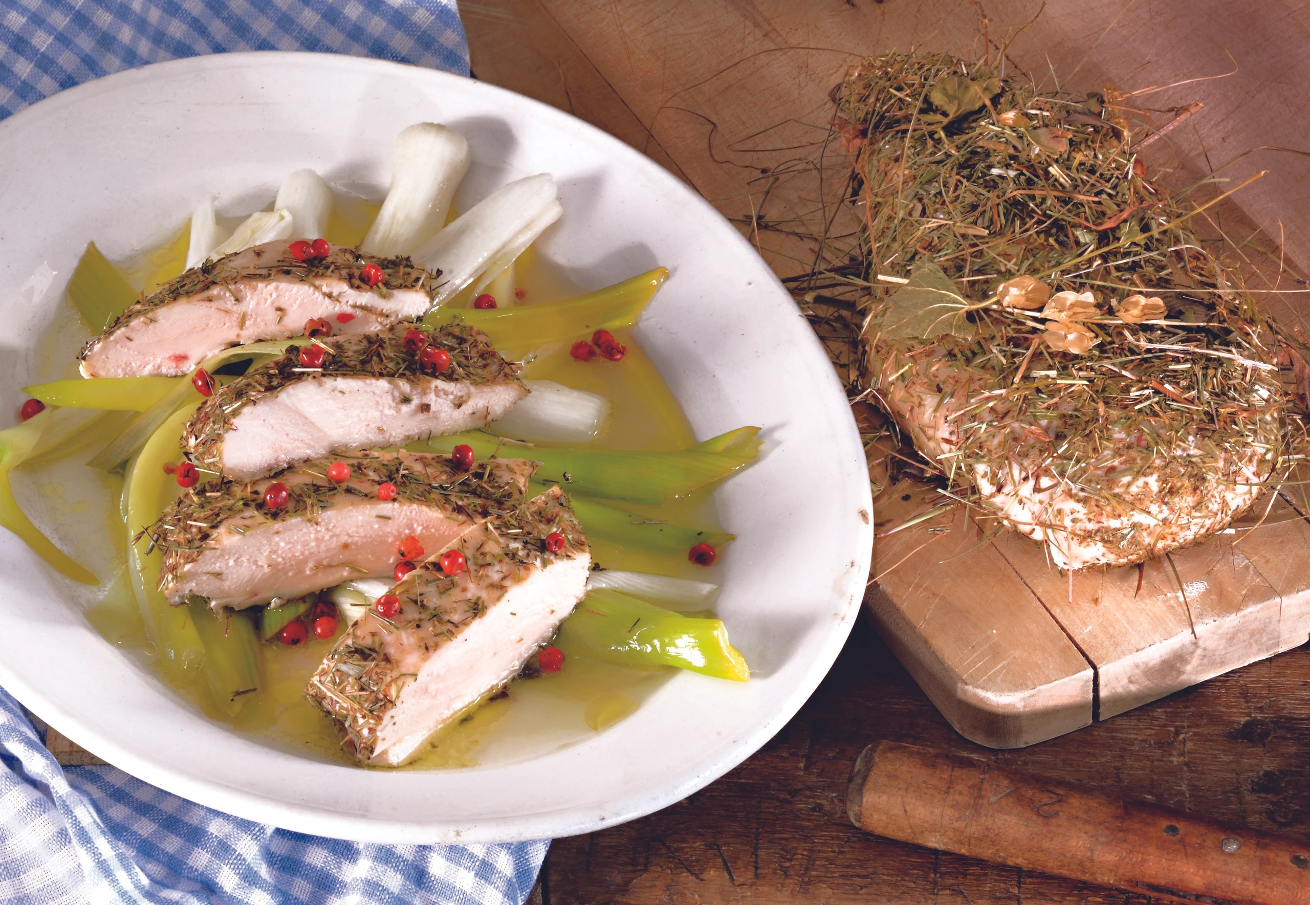 Filets aus dem Rohr nehmen und kurz rasten lassen. Aus der Folie nehmen, in Scheiben schneiden, auf den Jungzwiebeln anrichten und mit Rosa Beeren bestreuen.