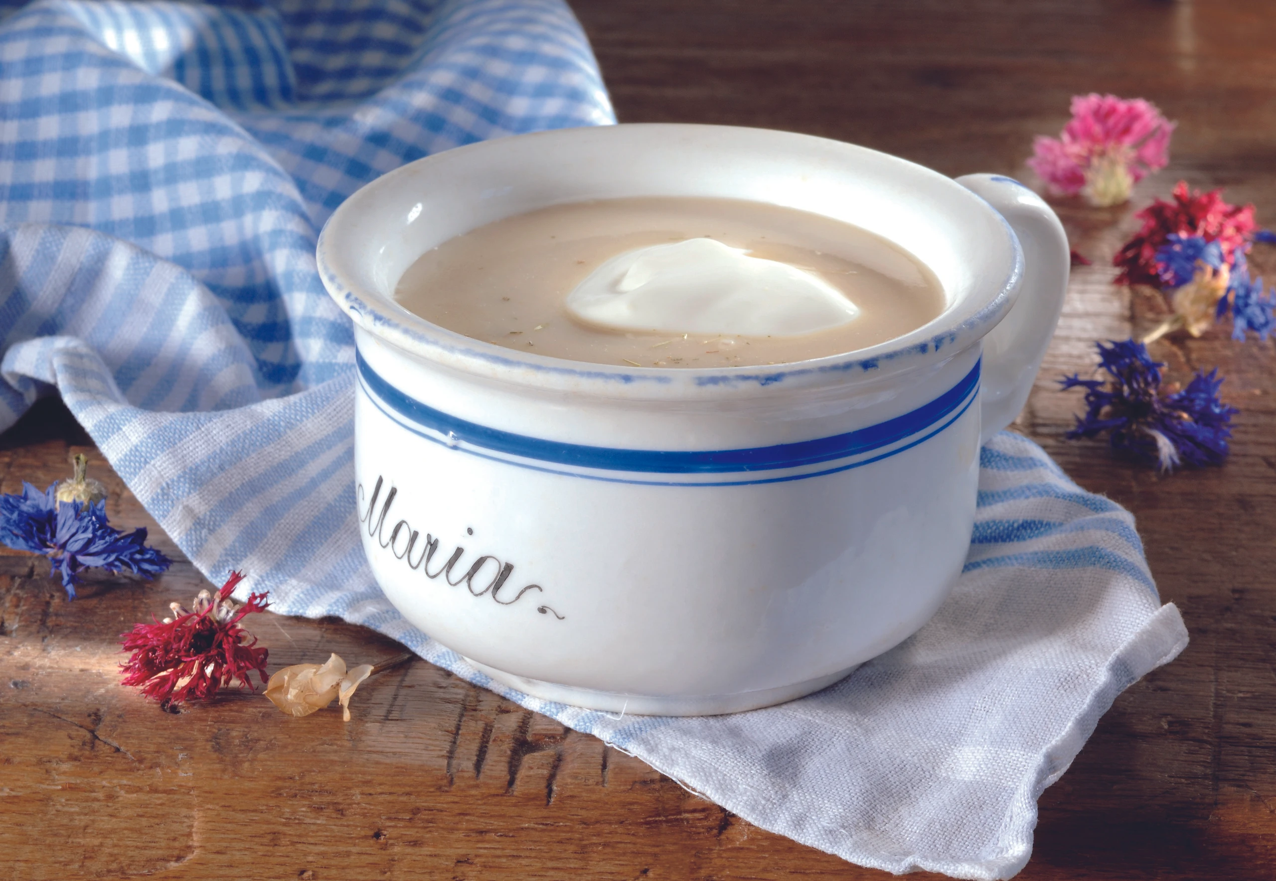 Gewürzkugel aus der Suppe nehmen. Suppe mit Rahm fein pürieren, mit Salz und Pfeffer abschmecken.