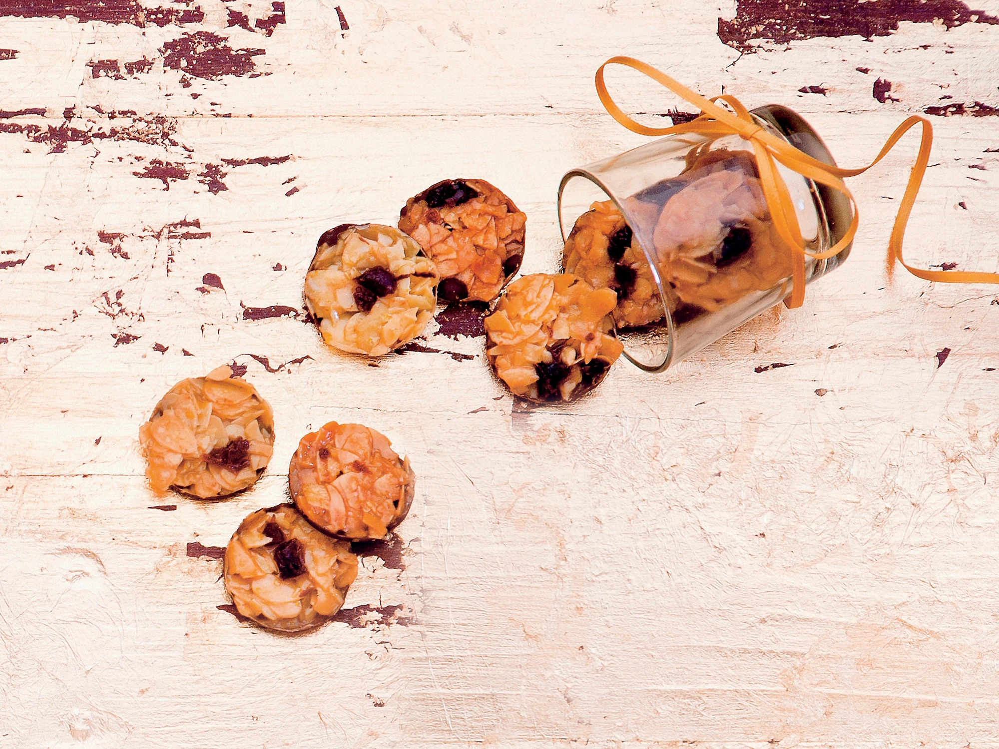 Obers, Butter, Zucker und Honig verrühren, aufkochen und ca. 3 Minuten köcheln. Mandeln und Aranzini unterrühren. Mischung auf den Blechen verstreichen und im Rohr goldbraun backen (ca. 10 Minuten). Herausnehmen und auskühlen lassen.