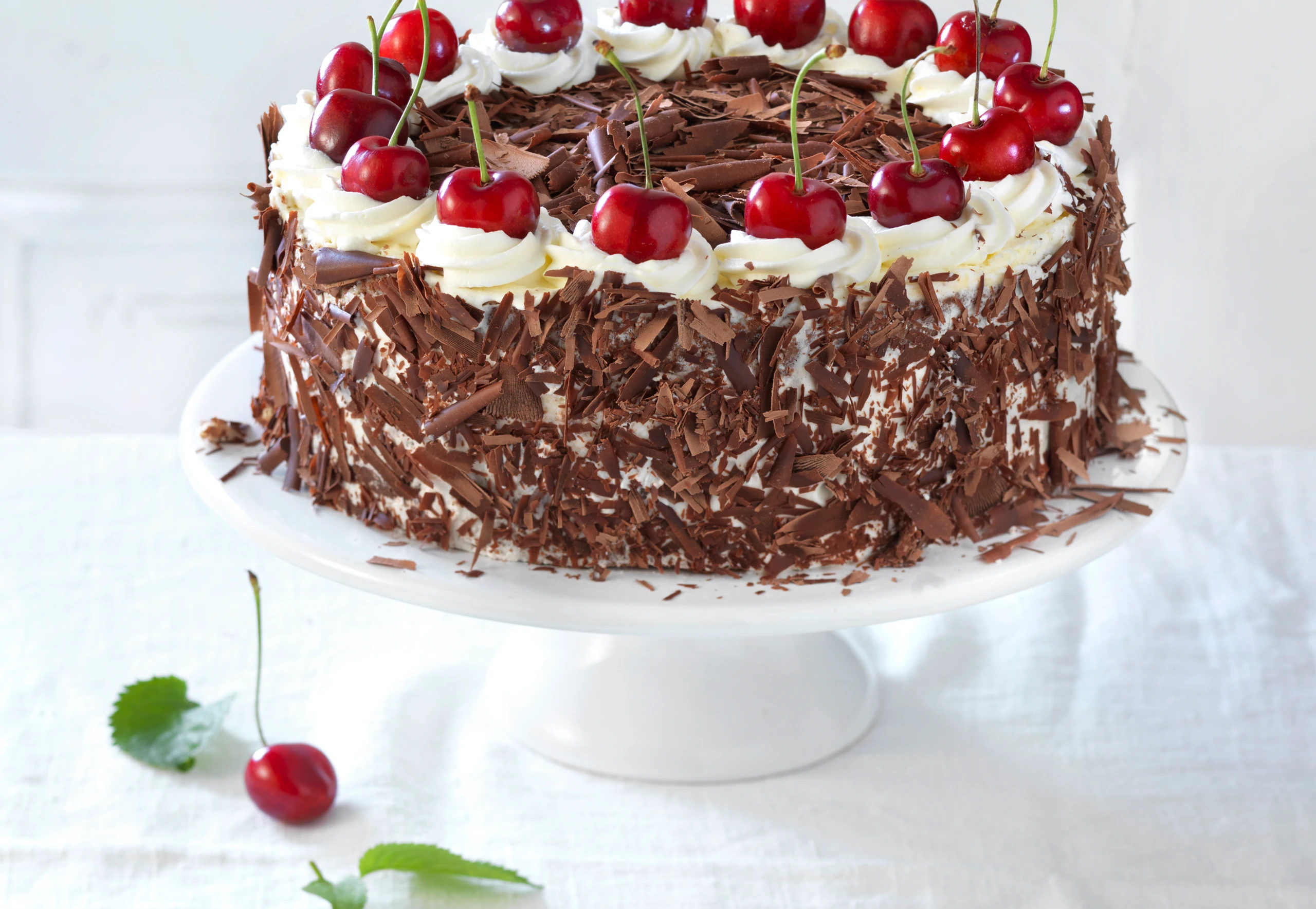 Für die Garnitur Obers schlagen und in einen Dressiersack (Sterntülle) füllen. Torte mit Schokospänen, Obers und Kirschen garniert servieren.
