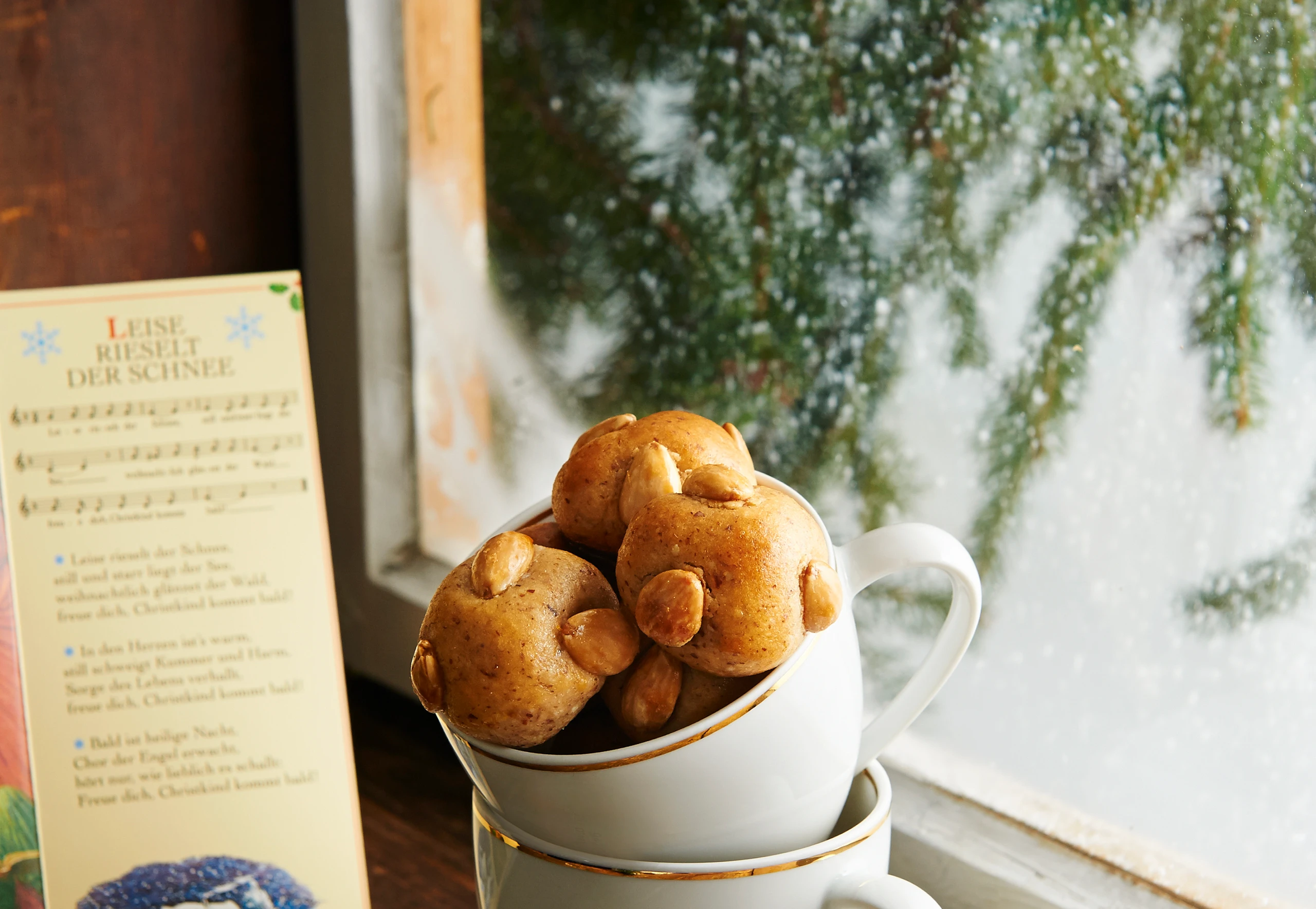Masse zu einer Rolle formen, in 23 Stücke (je ca. 20 g) schneiden und zu Kugeln rollen. Kekse auf das Blech setzen, jeweils 3 Mandeln in die Kugeln setzen und fest andrücken. Dotter mit 1 EL Wasser verrühren und die Bethmännchen damit bestreichen. Im Rohr bei 160°C (zweite Schiene von unten) ca. 15 Minuten backen. Herausnehmen und auf dem Blech auskühlen lassen.