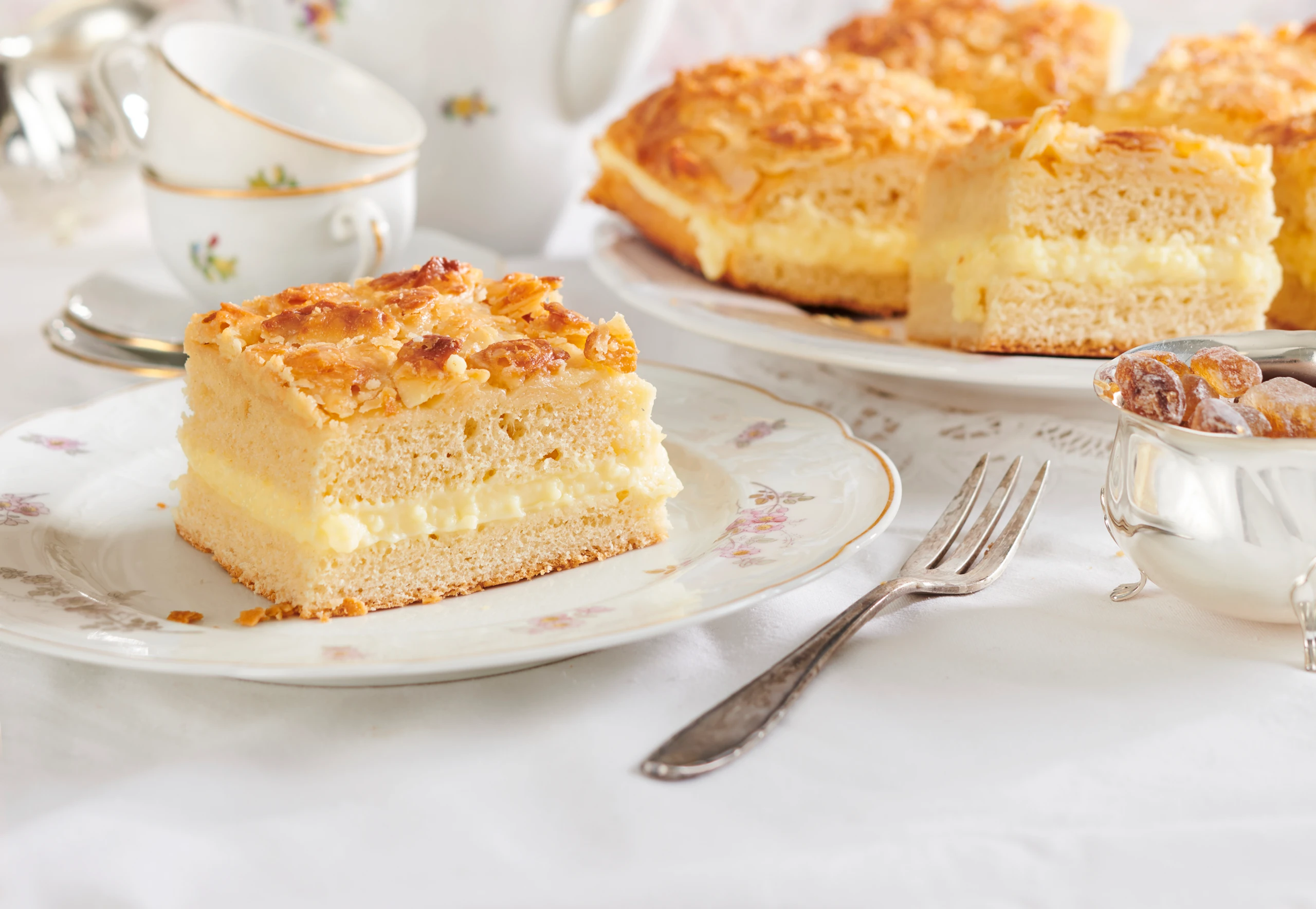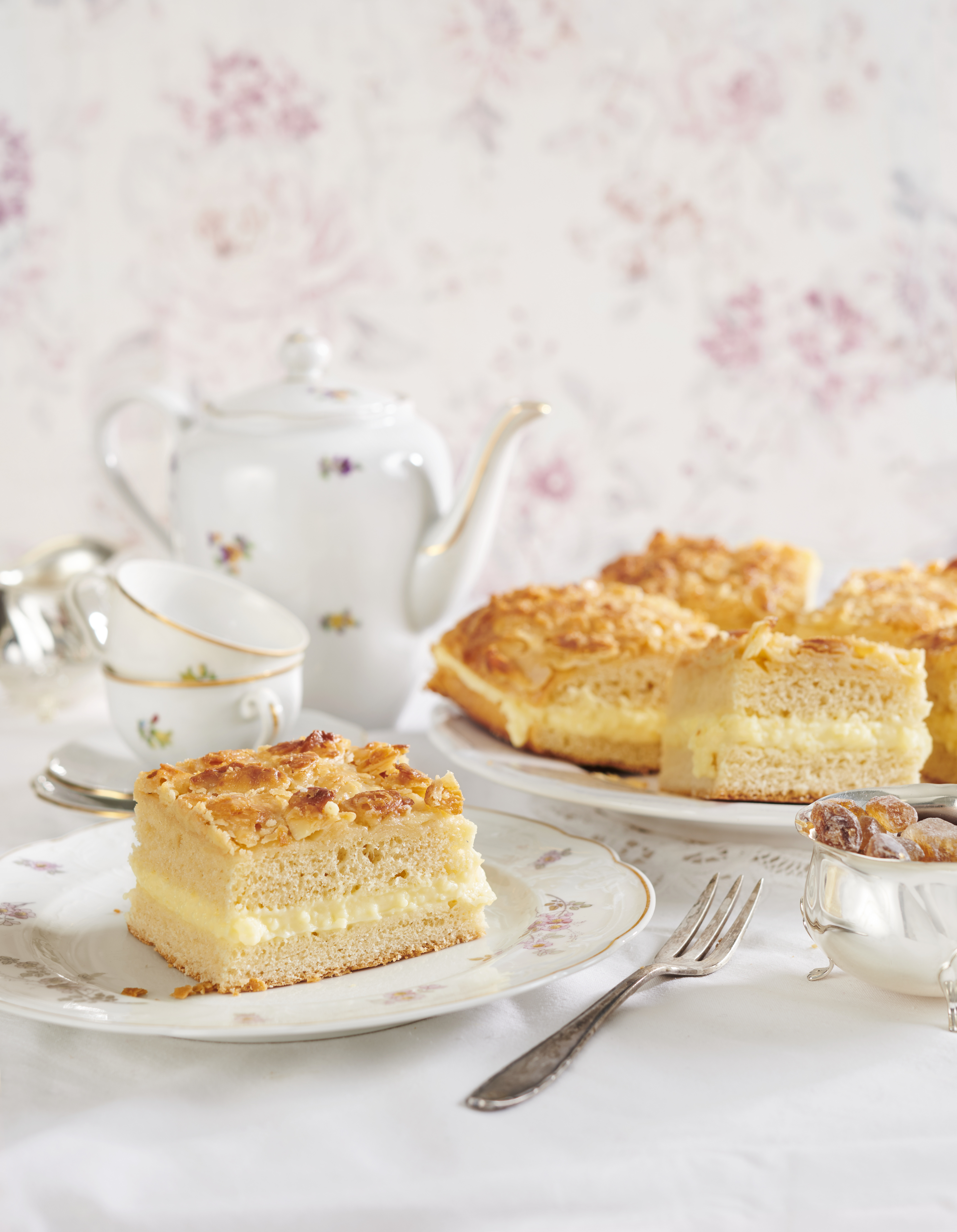 Kuchen horizontal halbieren. Kuchenstücke mit der Vanillecreme bestreichen und zusammensetzen. Bienenstich in Stücke schneiden und servieren.