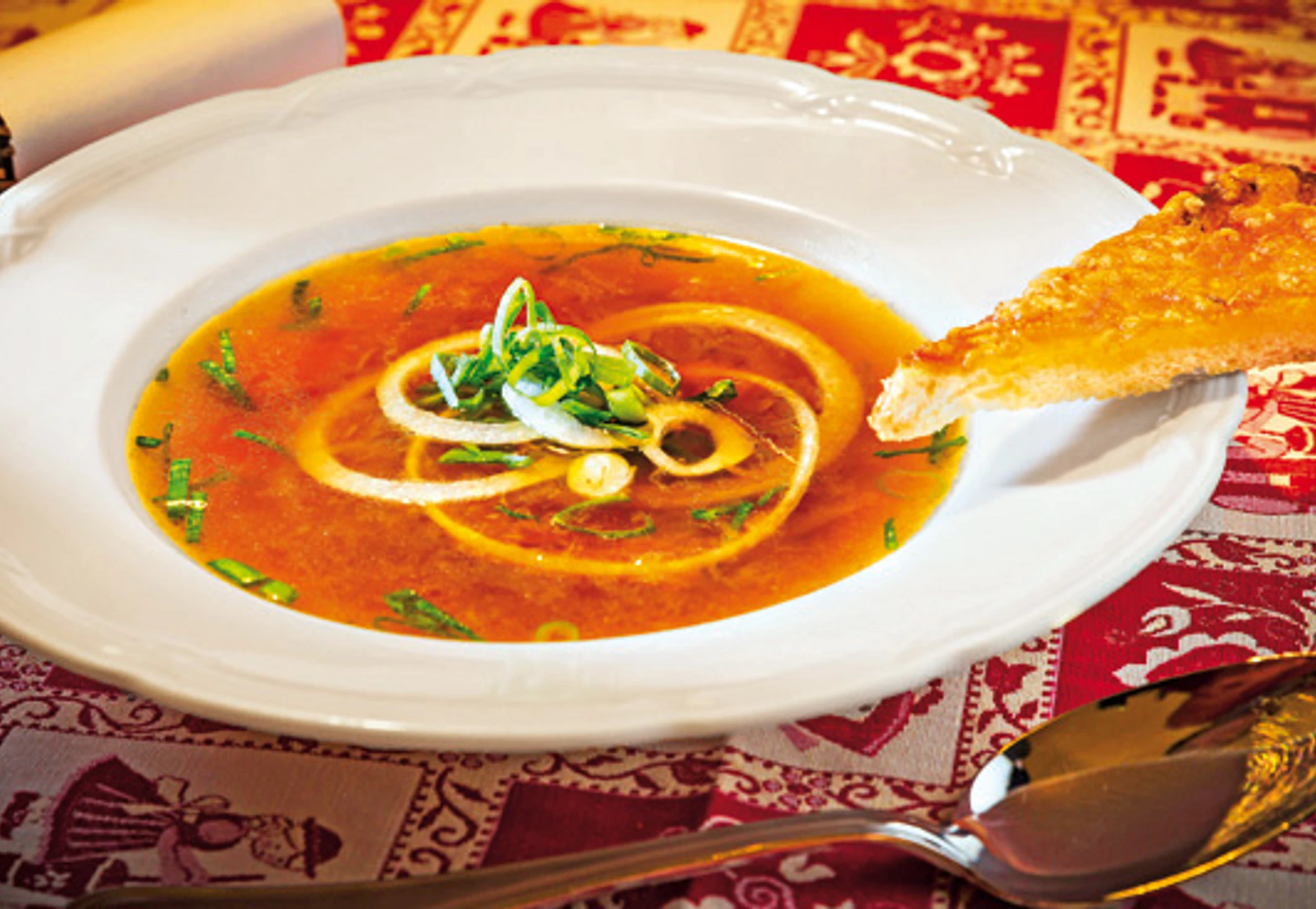 - Stärke mit 2 EL Wasser vermischen, Suppe damit binden. Suppe anrichten und mit den Croûtons garniert und eventuell mit dünn geschnittenem Jungzwiebel bestreut servieren.
