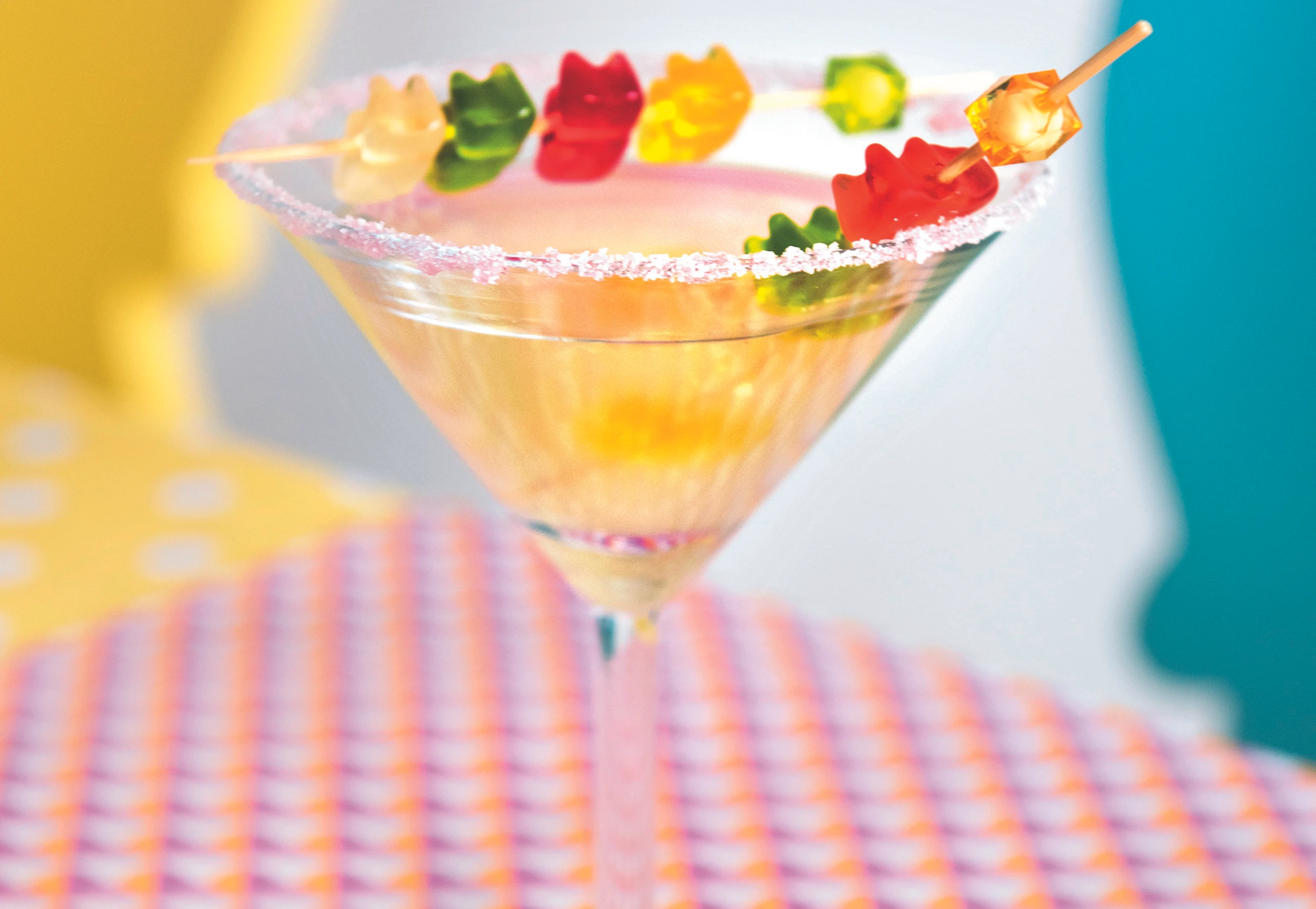 - Glasränder mit Cranberry-Saft befeuchten und in Kristallzucker drücken. Drink einfüllen. Gummibärchen auf Cocktailspieße stecken, die Cocktails damit garnieren.