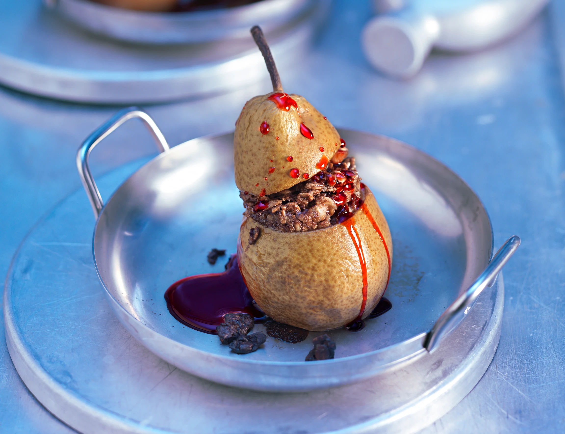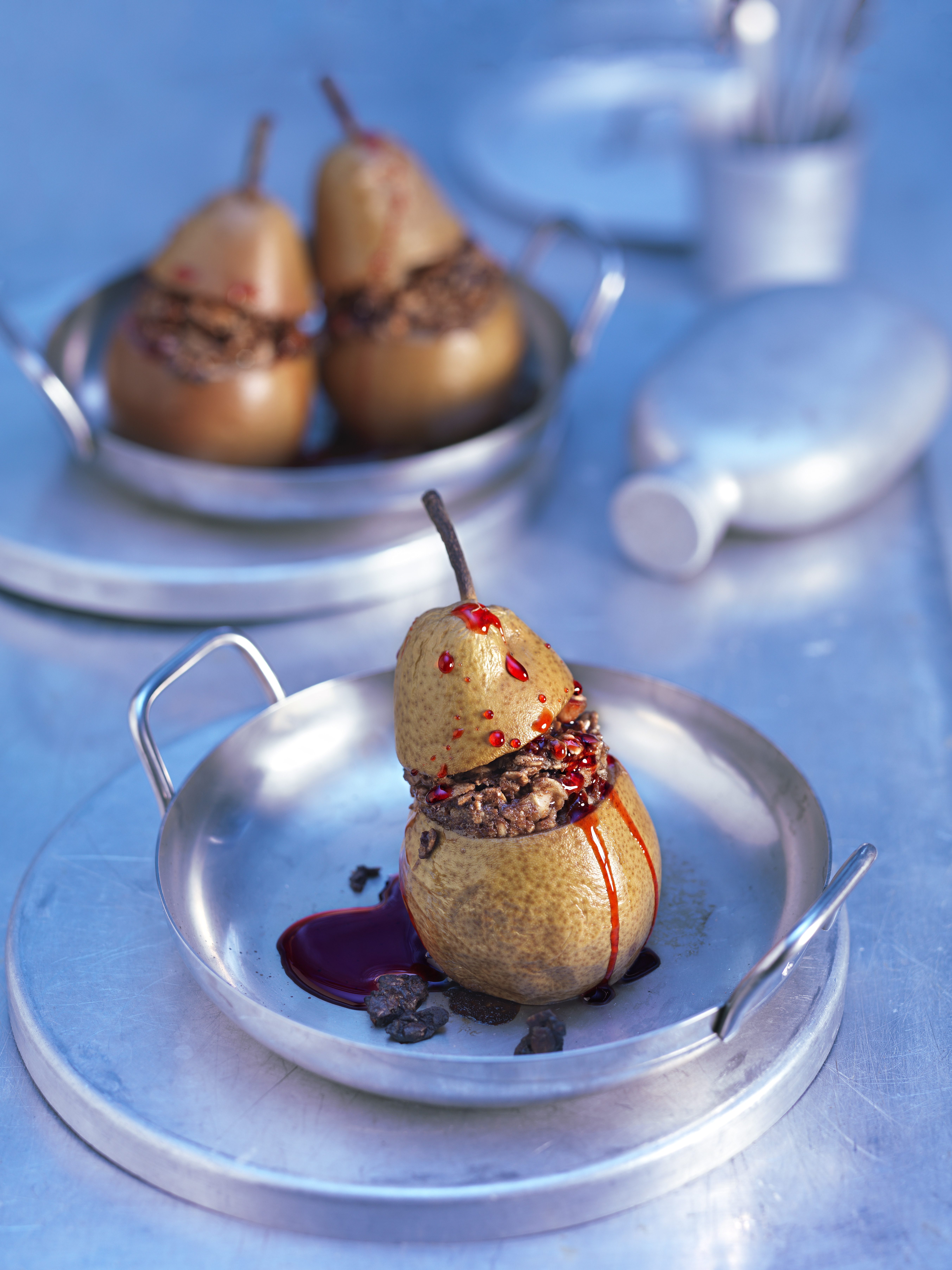 - Birnen mit der Nougatmasse füllen, Deckel aufsetzen. Aus der restlichen Masse Nockerl formen. Birnen und Nockerl in die Form geben und im Rohr (untere Schiene / Gitterrost) ca. 25 Minuten backen. Birnen anrichten und mit Grenadinesirup servieren.