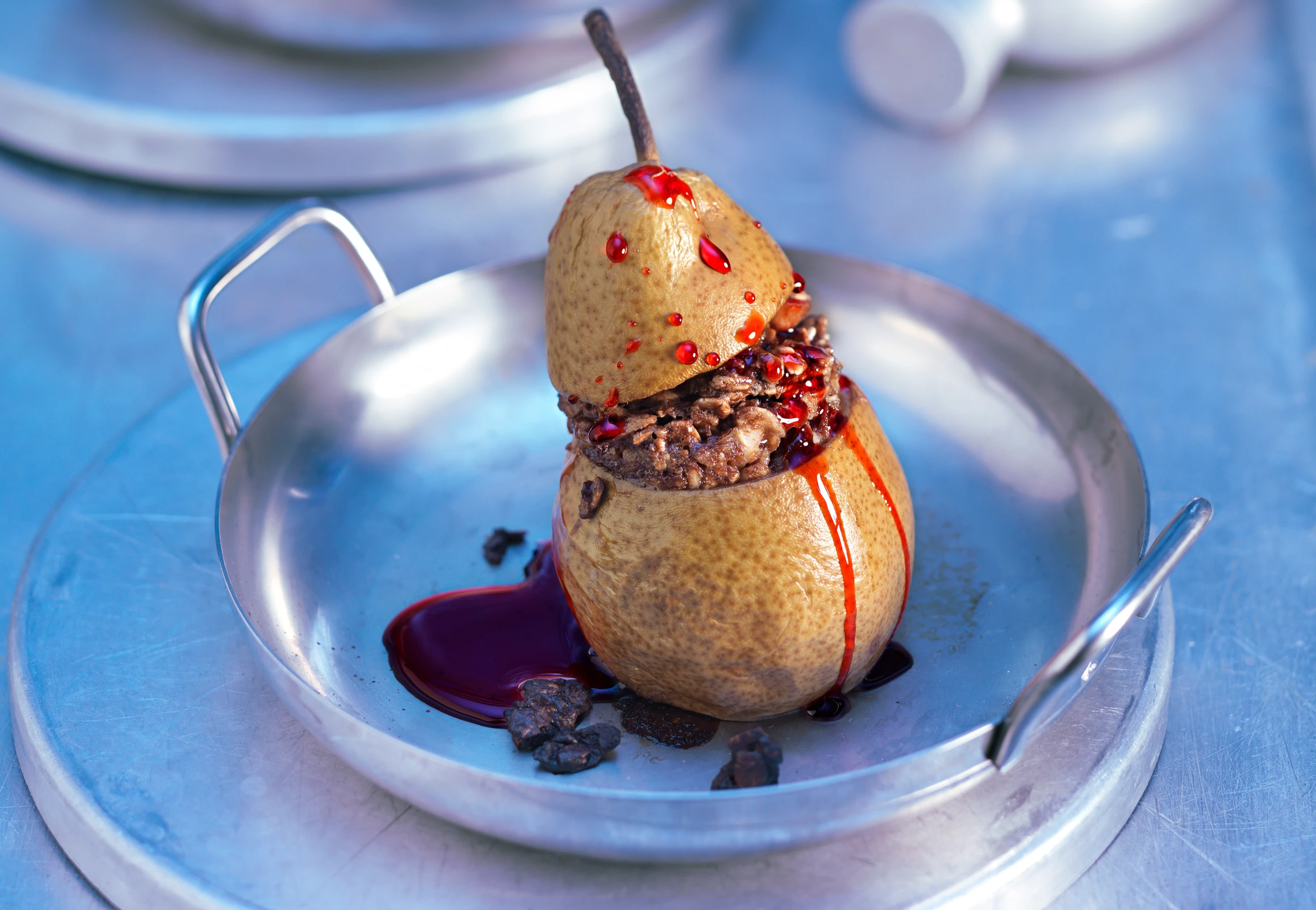 Birnen mit der Nougatmasse füllen, Deckel aufsetzen. Aus der restlichen Masse Nockerl formen. Birnen und Nockerl in die Form geben und im Rohr (untere Schiene / Gitterrost) ca. 25 Minuten backen. Birnen anrichten und mit Grenadinesirup servieren.