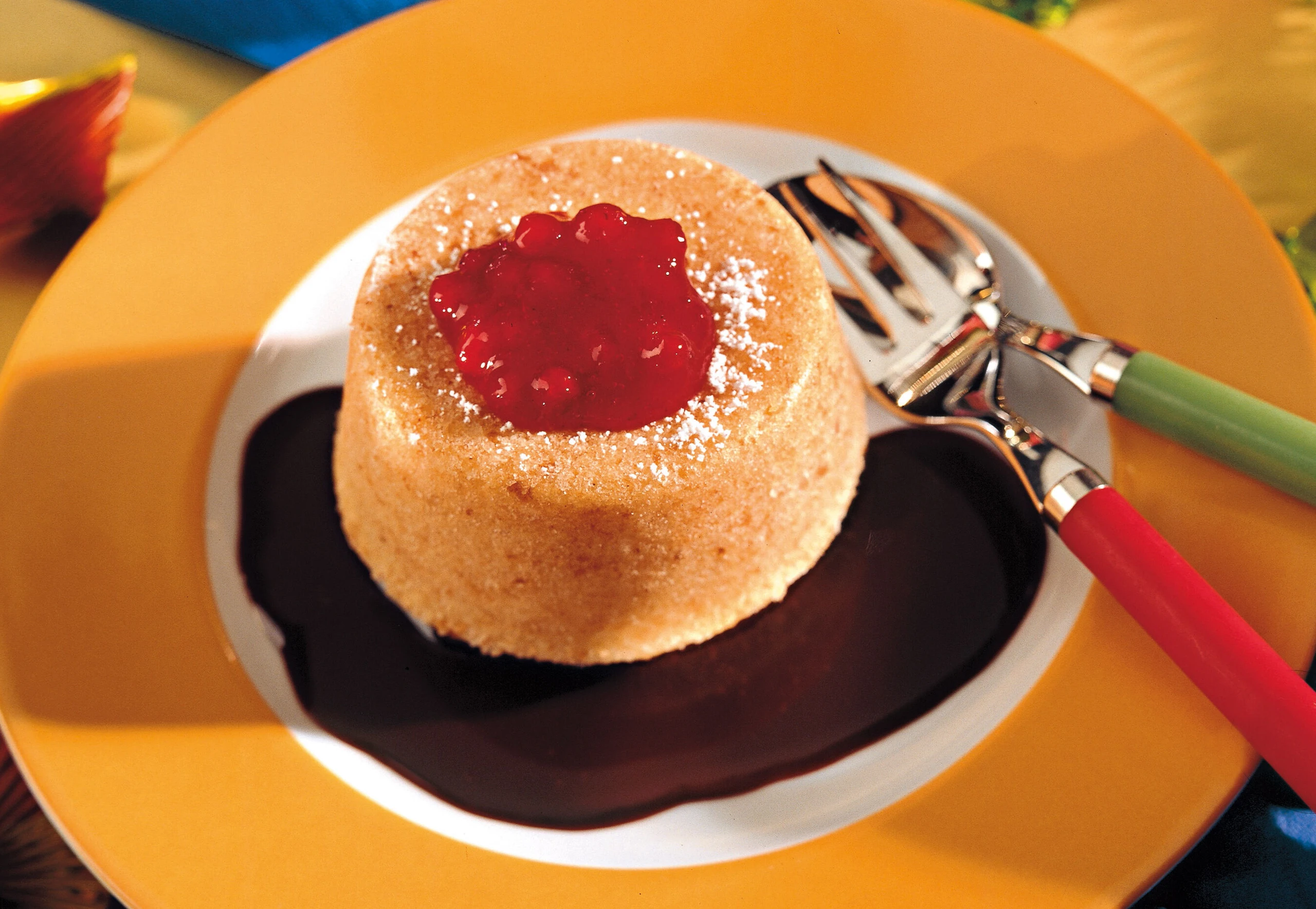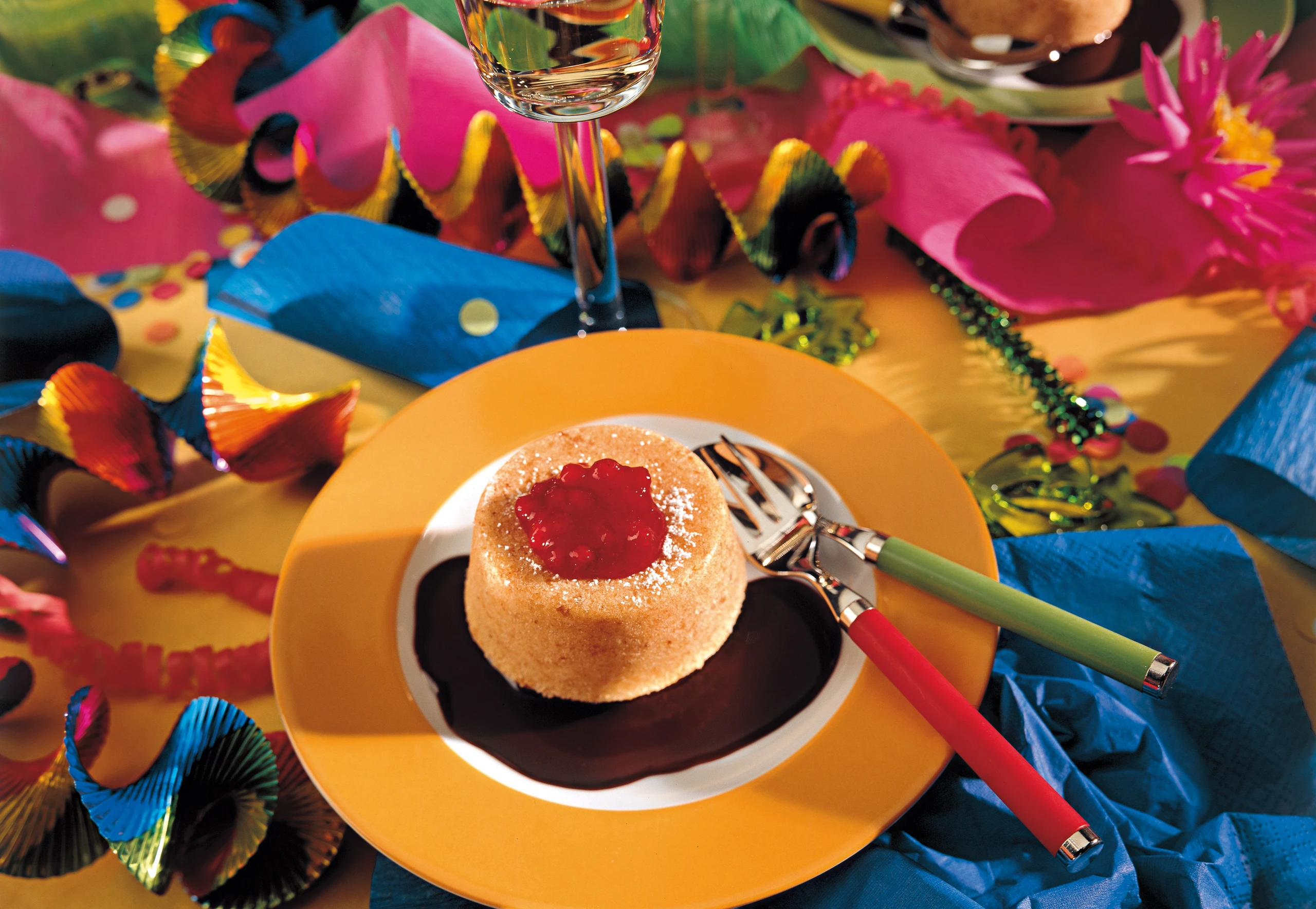 Die Aufläufe aus dem Backrohr nehmen, ca. 10 Minuten rasten lassen, aus den Förmchen stürzen, mit Staubzucker bestreuen, mit Preiselbeerkompott garnieren und mit Schokoladesauce anrichten.