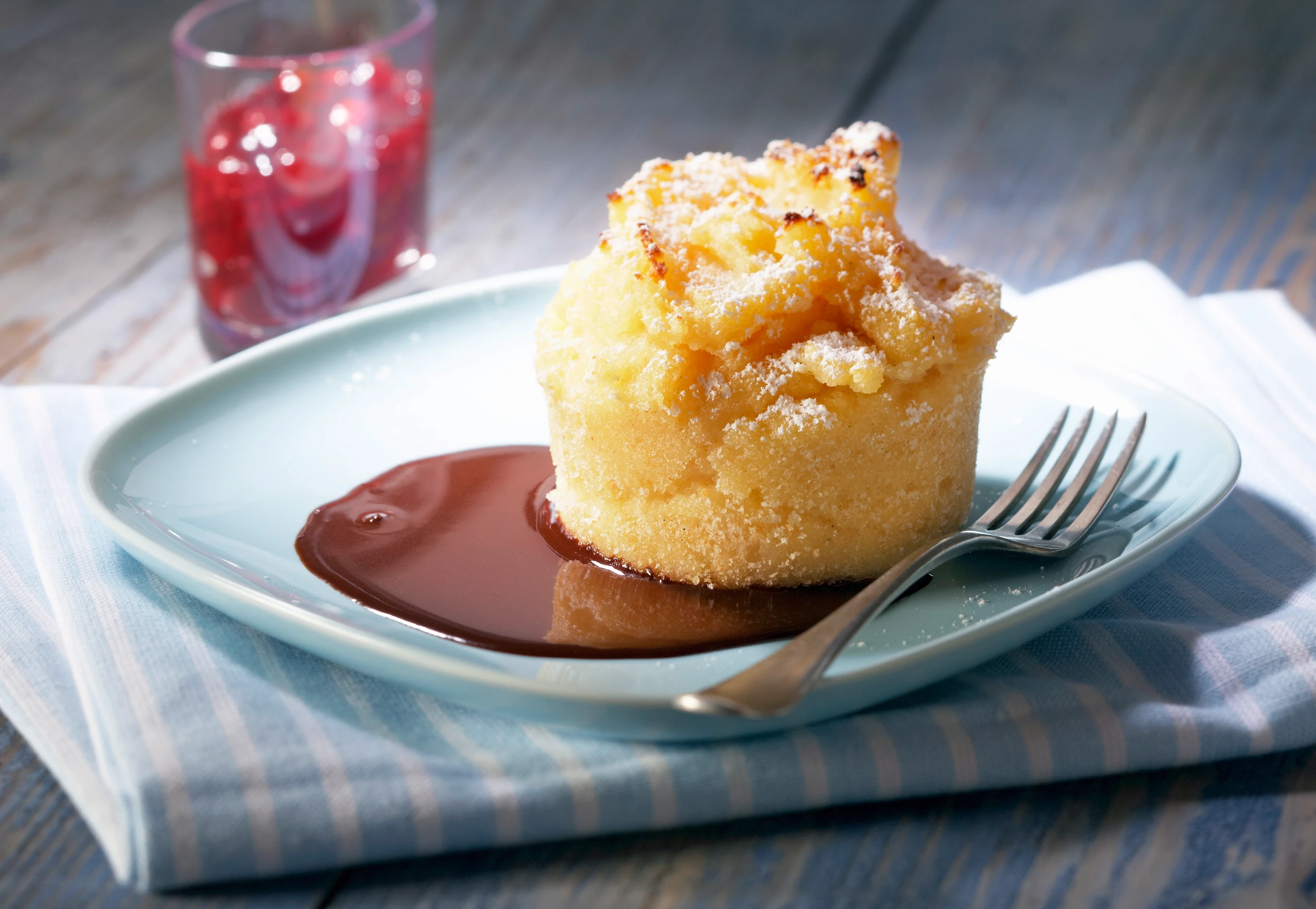 Aufläufe herausnehmen, mit Schokoladesauce anrichten, mit Staubzucker bestreuen und mit dem Kompott servieren.