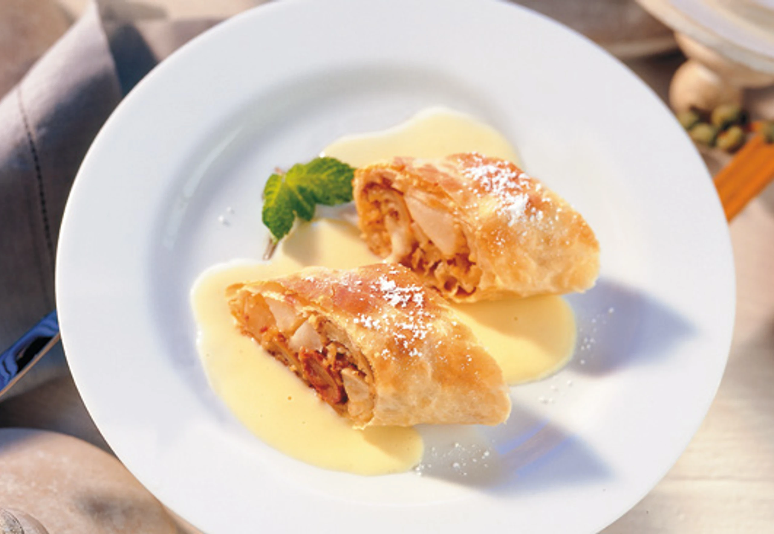 - Strudel aus dem Rohr nehmen, mit Staubzucker bestreuen und vor dem Anschneiden einige Minuten rasten lassen. Birnen-Dattel-Strudel mit der vorbereiteten Zimtsauce anrichten und mit Minzeblättern garnieren.