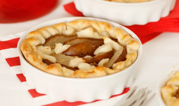 - Von den Birnen Kerngehäuse ausschneiden, Birnen in Spalten schneiden. Käse in Stücke brechen. Beides auf dem Teigboden verteilen und mit Pfeffer würzen. Überstehenden Rand wellig andrücken. Quiches im Rohr (mittlere Schiene / Gitterrost) 25 Minuten backen.