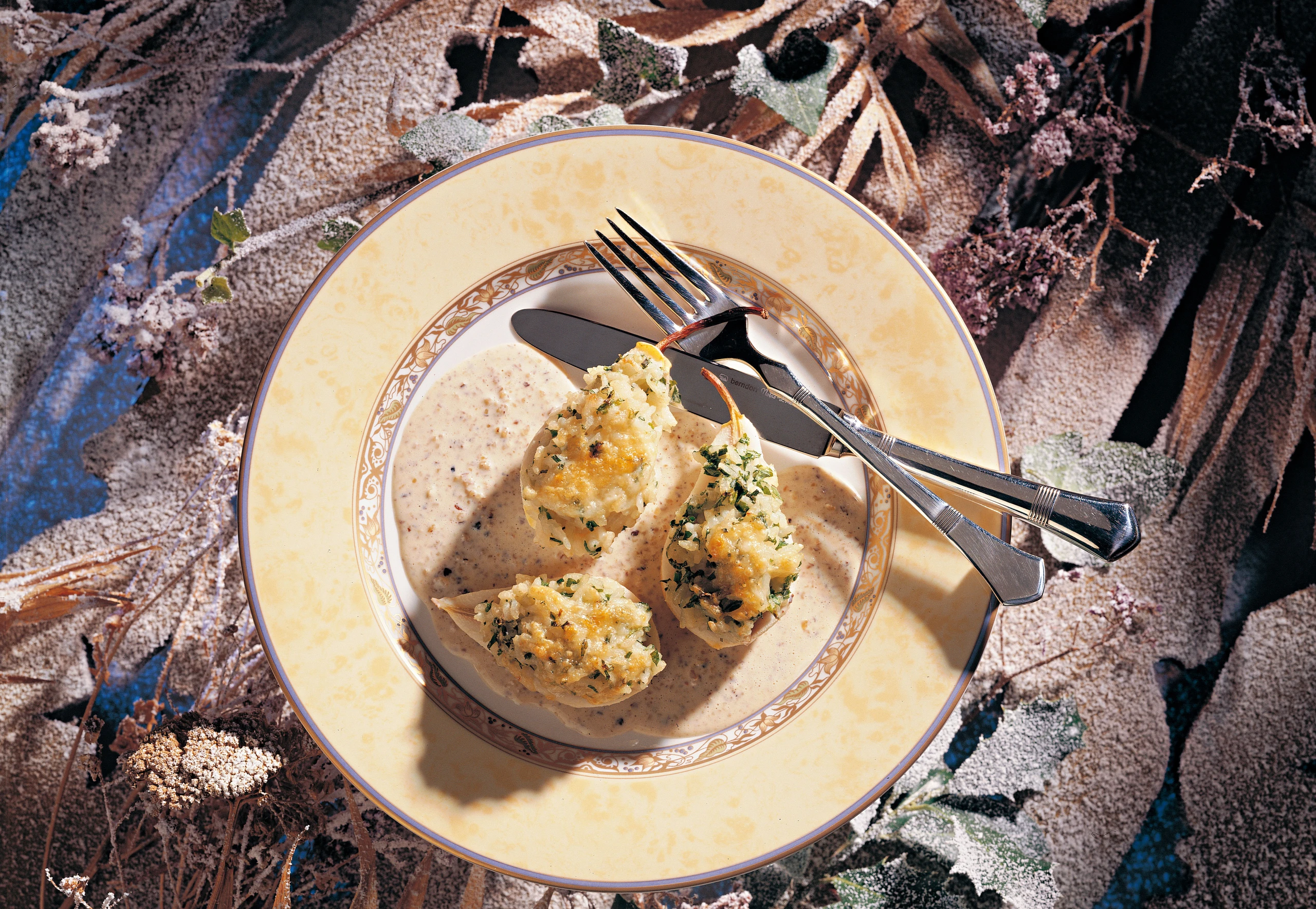 Suppe aufkochen, Schlagobers zugießen und zu cremiger Konsistenz einkochen. Sauce mit Salz, Pfeffer, Zitronensaft und abgeriebener Muskatnuss würzen. Vor dem Servieren geriebene Walnüsse untermischen und die Sauce mit einem Stabmixer aufschlagen.