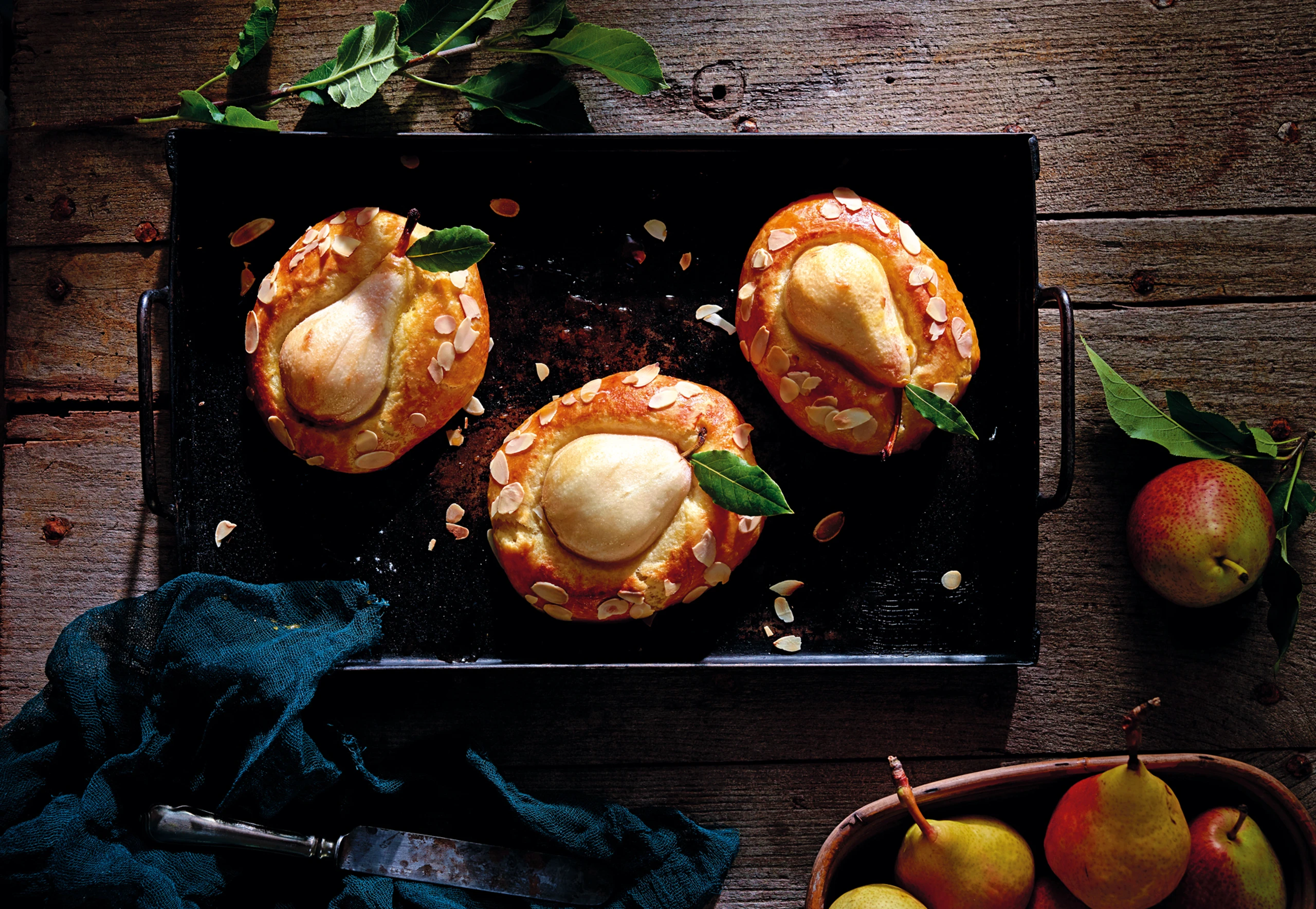 Birnen halbieren und das Kerngehäuse mit einem Parisienneausstecher herauslösen. Birnen mit Crème Pâtissière füllen. Übrige Crème auf dem Marzipan verstreichen. Birnenhälften auf das Marzipan legen. Brioches mit Folie abdecken und ca. 30 Minuten rasten lassen.