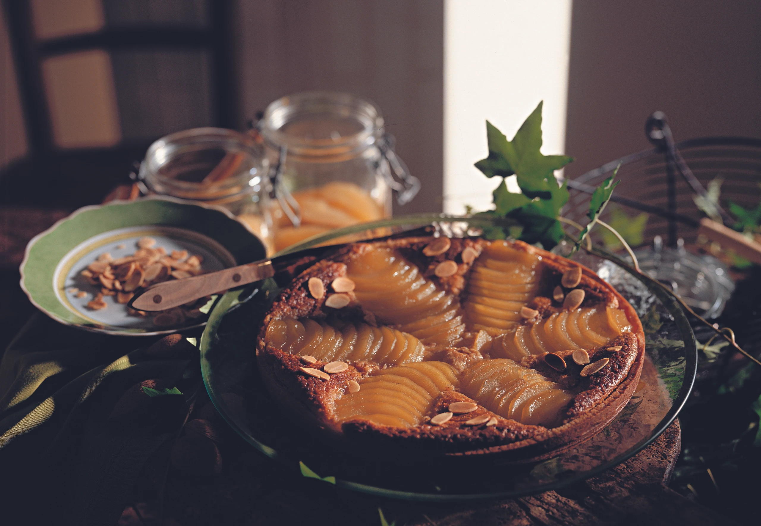 - Masse in die mit Teig ausgelegte Form füllen, gleichmäßig verstreichen, mit den Birnen belegen und mit den Mandelblättchen bestreuen. Die Birnentarte im vorgeheizten Rohr (mittlere Schiene / Gitterrost) ca. 3/4 Stunden backen.