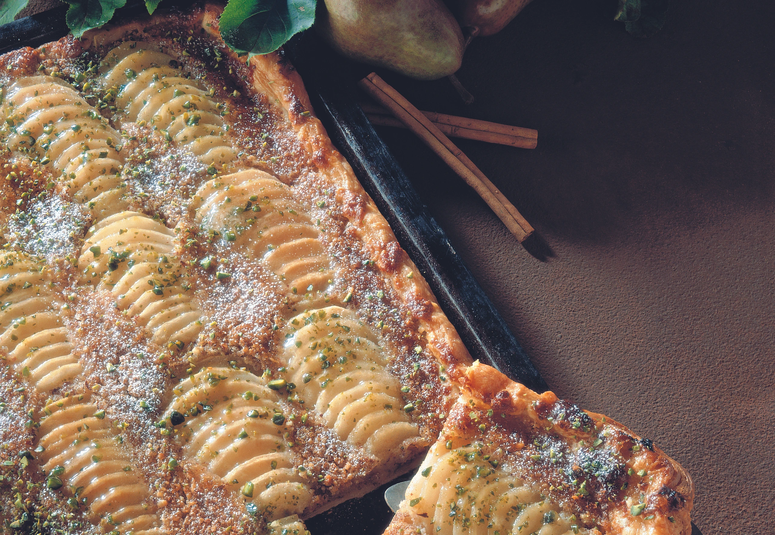 Nußmasse mit den Birnenscheiben belegen, leicht andrücken. Den Kuchen im vorgeheizten Rohr (mittlere Schiene) ca. 40 Minuten backen.