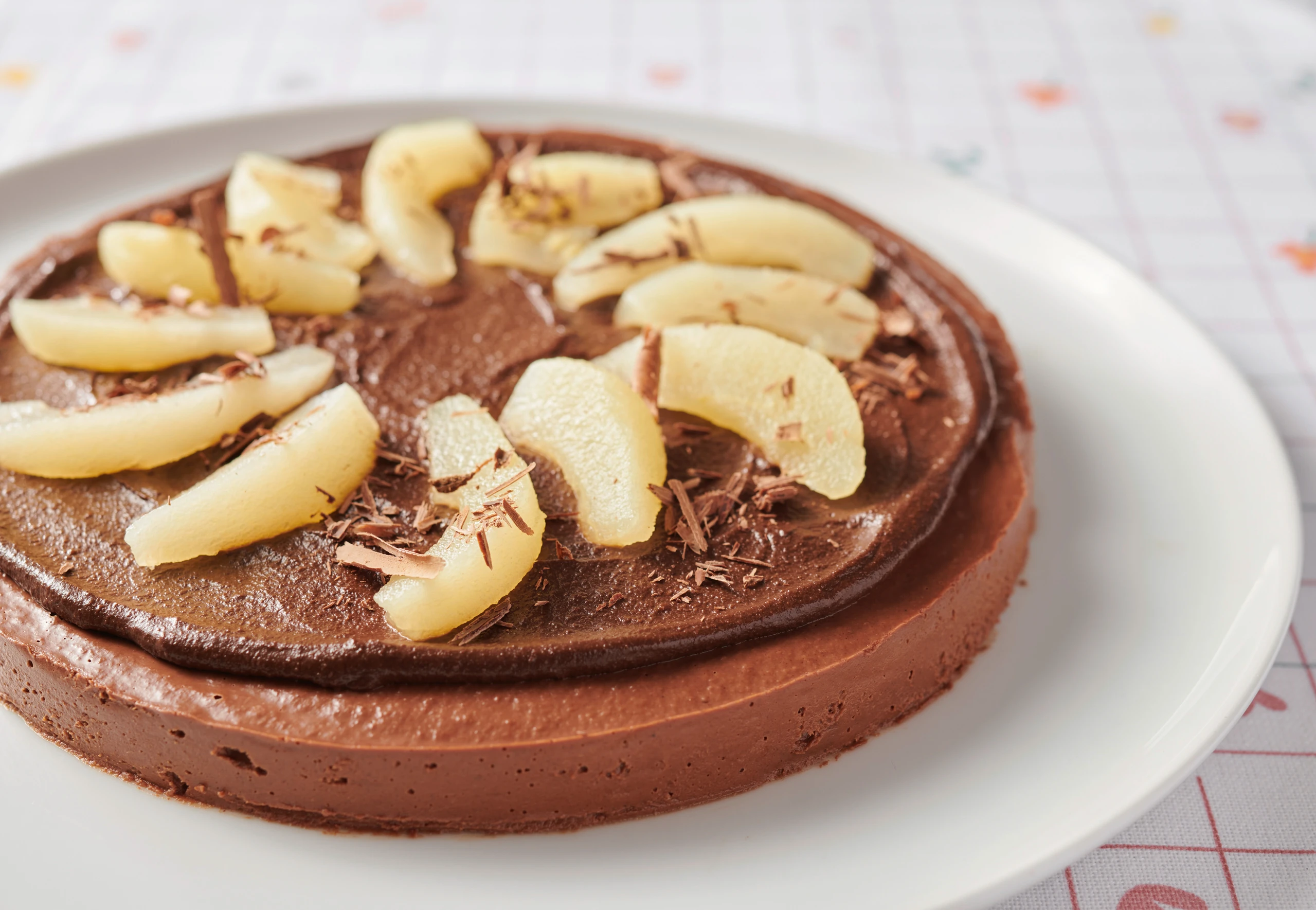 Übrige Datteln, Kakao und heißes Wasser fein pürieren und auf der Tarte verstreichen. Deko-Birnen in Spalten schneiden und darauflegen. Mit den Schokoraspeln bestreuen.
