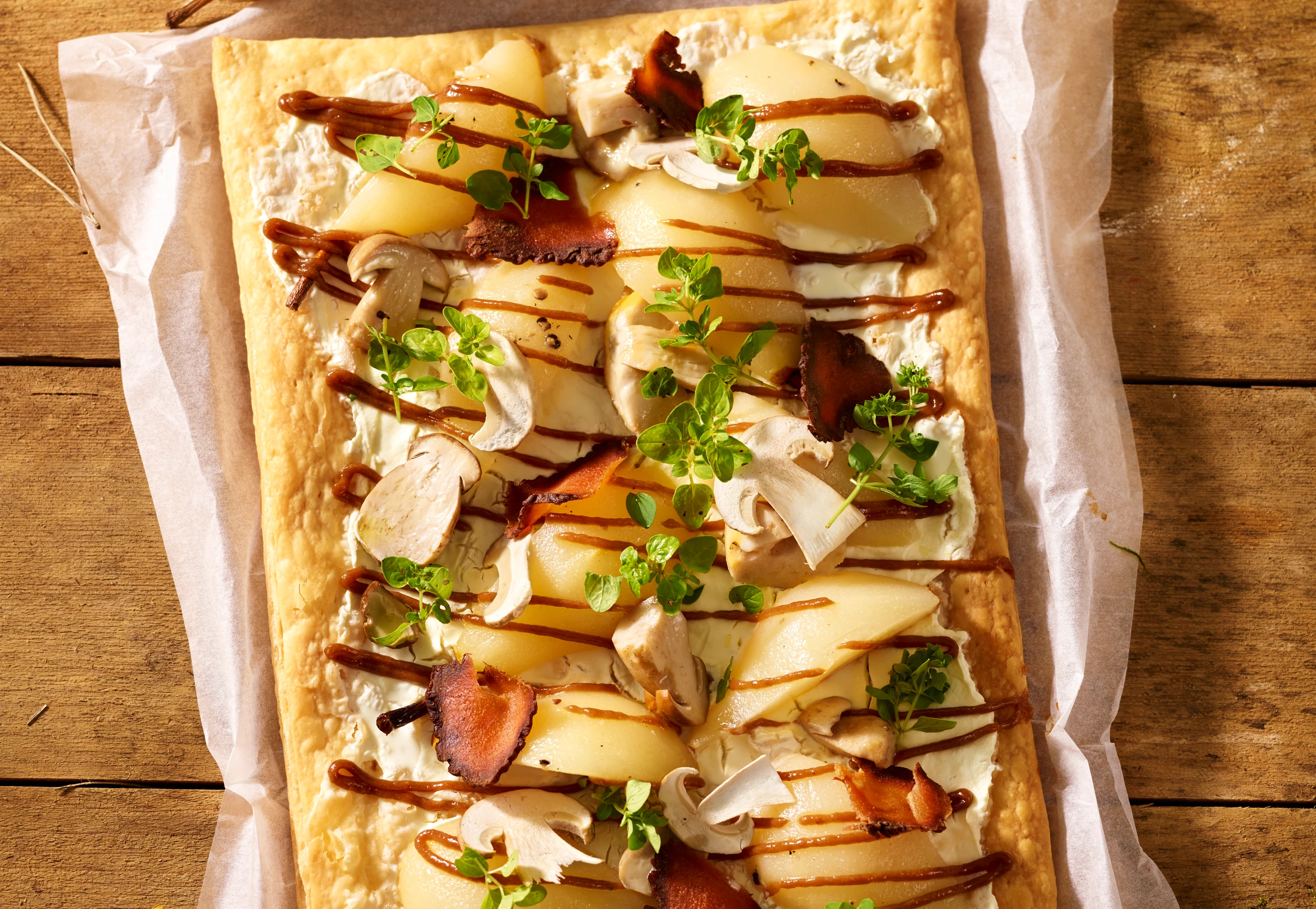 Kletze in dünne Scheiben schneiden. Crème fraîche mit Salz und Cayenne abschmecken und auf dem Teigboden verstreichen. Mit Birnen, Steinpilzen und Kletze belegen, mit Tamarindensauce und Kräuterblättchen garnieren.