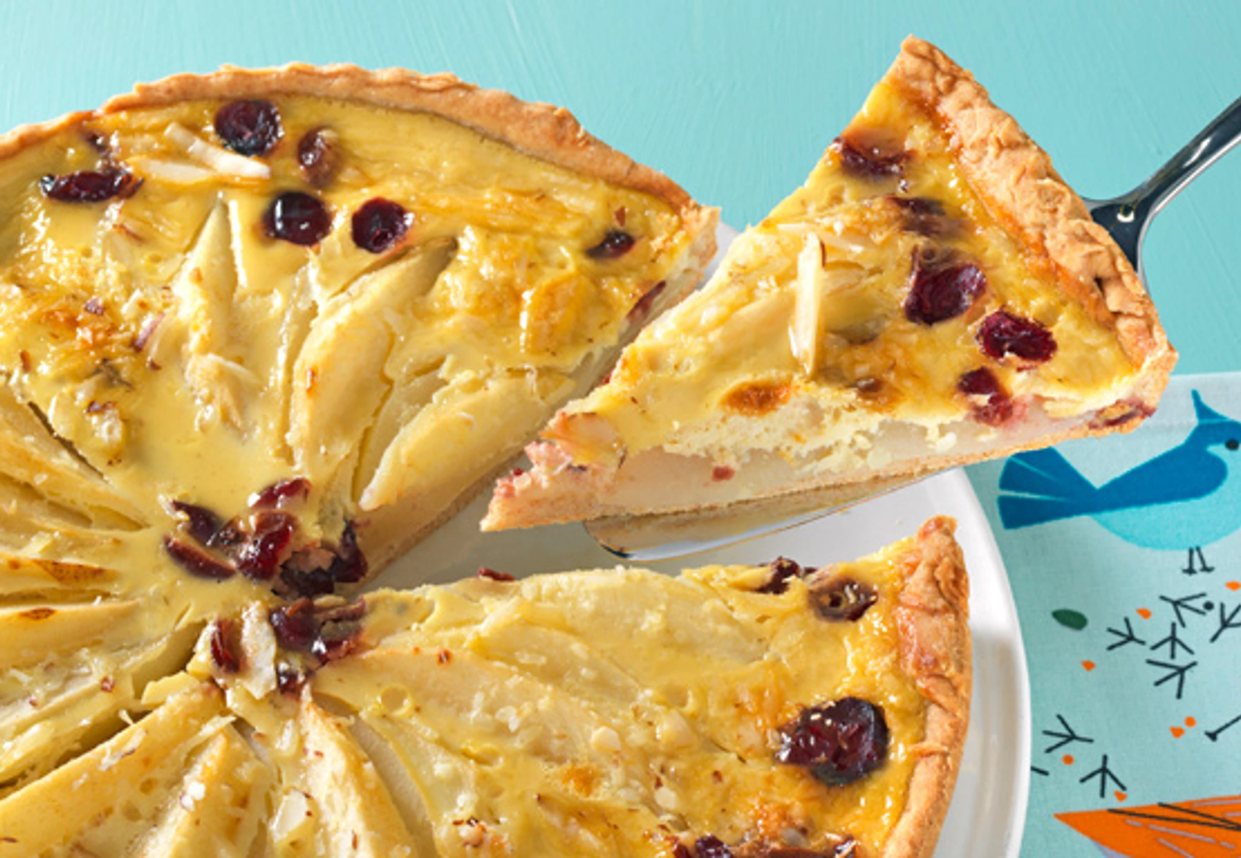 - Teig auf einer gut bemehlten Arbeitsfläche kurz durchkneten, dünn ausrollen und die Form damit auslegen. Birnenspalten darauf verteilen, mit Cranberries und Pekannüssen bestreuen und mit der Joghurt-Masse übergießen.