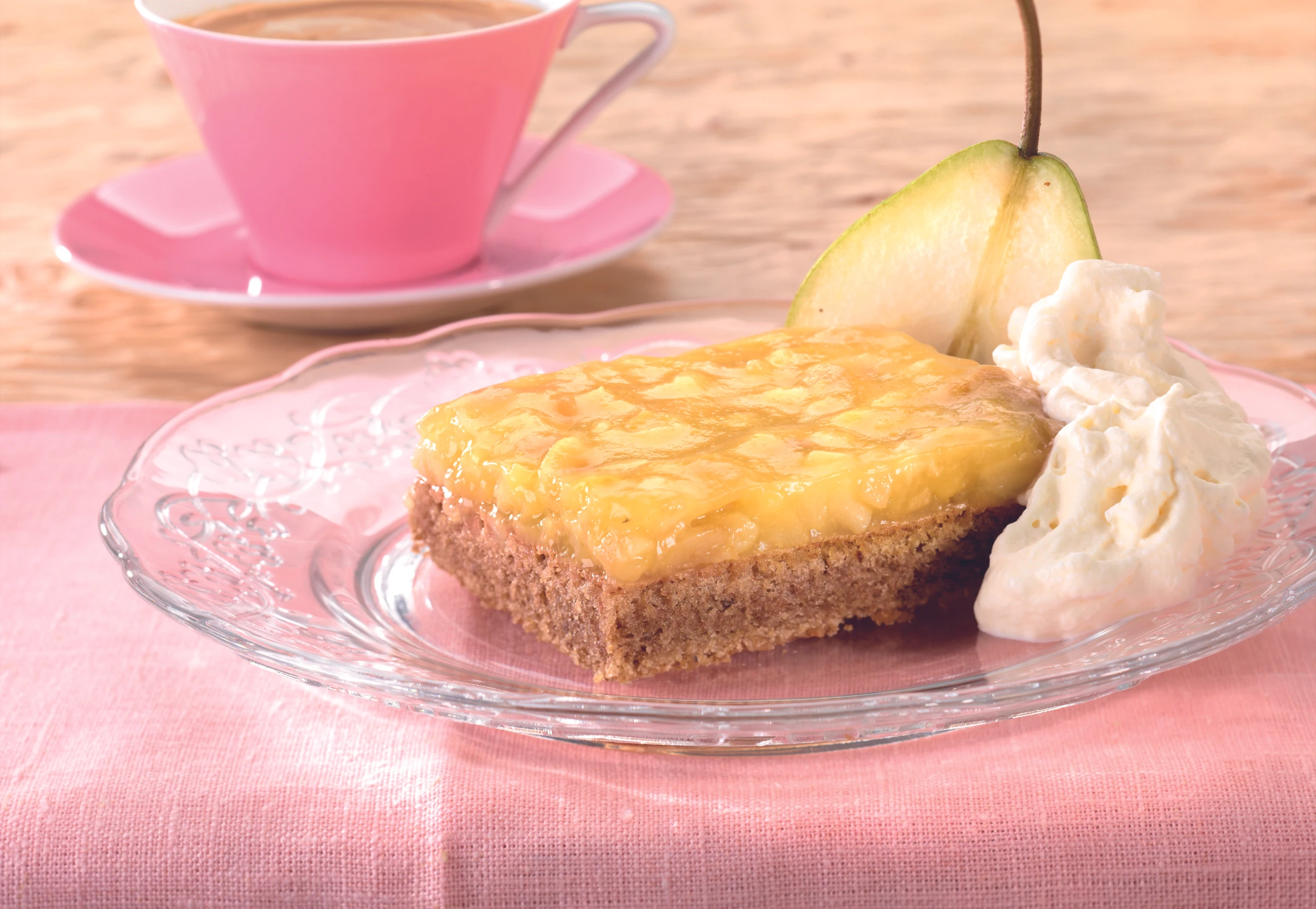 Birnen schälen, entkernen und grob würfelig schneiden. Mit Birnen- und Zitronensaft einmal aufkochen, auskühlen lassen. Saft abseihen, mit Puddingpulver glatt rühren und aufkochen. Birnen untermischen und kurz mitkochen. Belag auf dem Teigboden verteilen. Zum Festwerden für 2 Stunden kühl stellen.