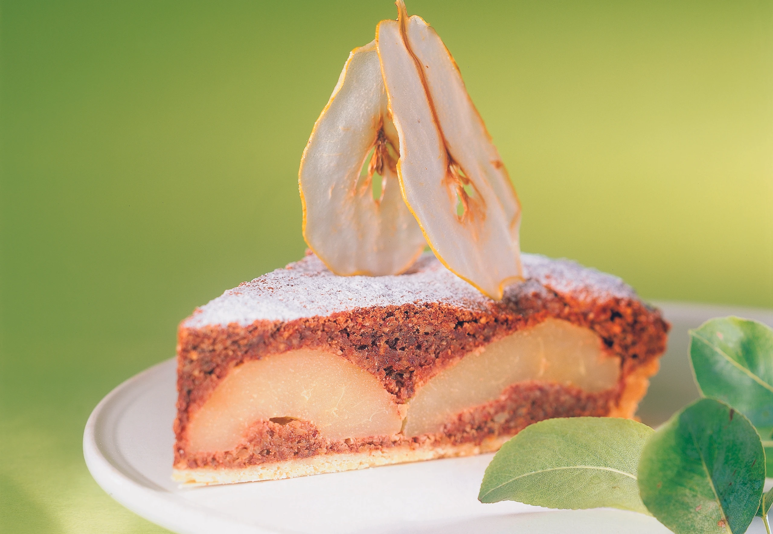 Birnen schälen, halbieren und Kerngehäuse ausschneiden. Birnen in 1 cm dicke Spalten schneiden. Ein Drittel der Fülle auf den Teigboden streichen, sternförmig mit den Birnenstücken belegen, restliche Masse darauf verteilen. Tarte im vorgeheizten Rohr (mittlere Schiene / Gitterrost) ca. 50 Minuten backen, aus dem Rohr nehmen und ca. 2 Stunden auskühlen lassen. Tarte mit Staubzucker bestreuen und mit den Birnenchips (siehe Rezept) garnieren.