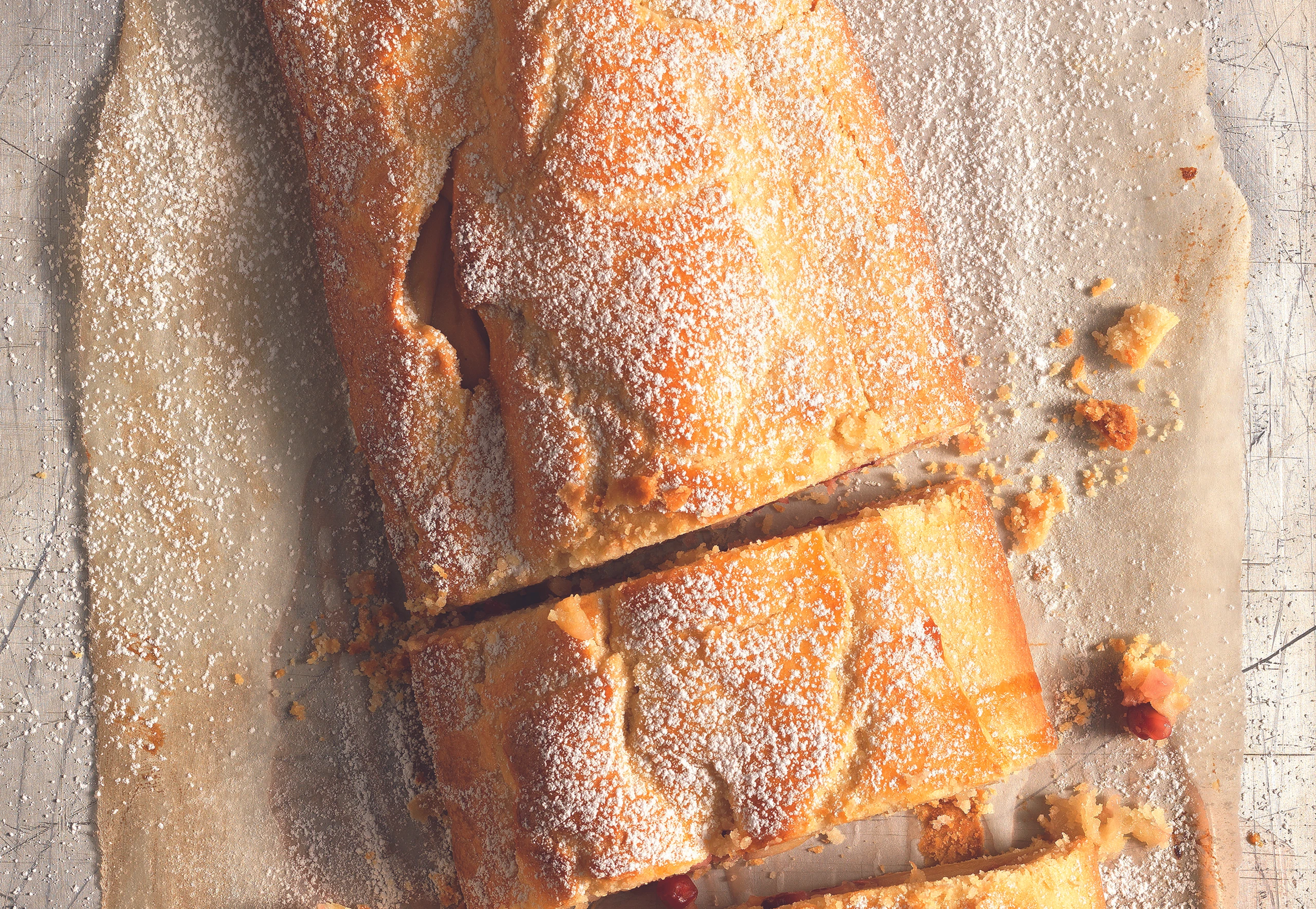 Strudel auf das Backblech setzen, mit Ei bestreichen und im Rohr (mittlere Schiene) ca. 25 Minuten backen.
