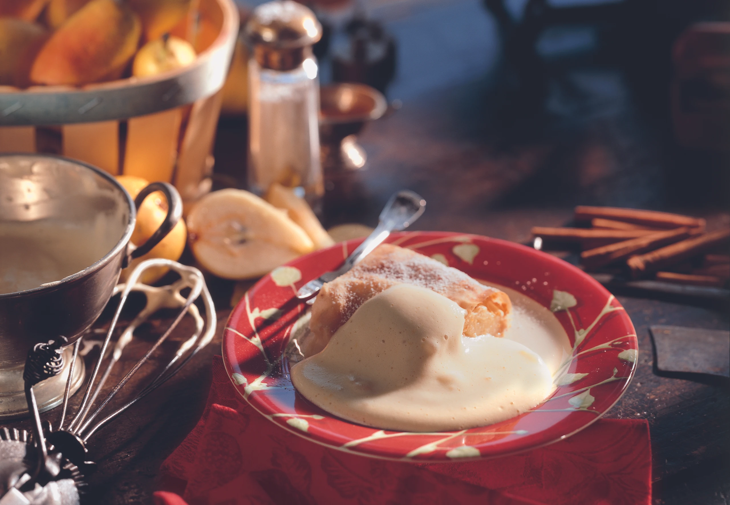 Strudel aus dem Rohr nehmen und abkühlen lassen. Mit Staubzucker bestreuen und anrichten, mit Weinschaum servieren.