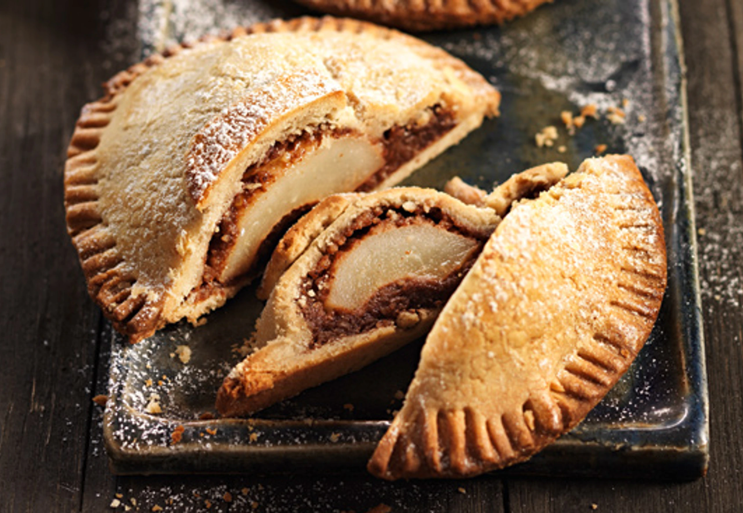 - Teig auf einer bemehlten Arbeitsfläche ca. 3 mm dick ausrollen, je 4 Scheiben mit Ø 12 cm und Ø 16 cm ausstechen. Auf den kleinen Teigscheiben die Hälfte von der Fülle so verteilen, dass jeweils ein 2 cm breiter Rand frei bleibt. Birnen auf die Fülle legen, behutsam andrücken, übrige Fülle darauf verteilen. Ränder mit Ei bestreichen, große Teigscheiben darauf legen und die Ränder mit einer Gabel zusammendrücken.