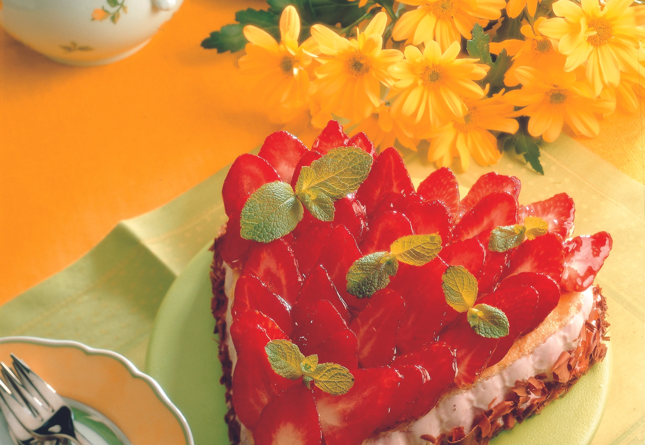 - Erdbeeren putzen, waschen, trockentupfen und in 1/2 cm dicke Scheiben schneiden. Tortengelee nach Packungsanweisung zubereiten. Torte dicht mit Erdbeeren belegen und mit dem Tortengelee bestreichen. Rand der Torte mit Schokoladespänen bestreuen. Torte ca. 1/2 Stunde kaltstellen. Mit Minze garnieren.