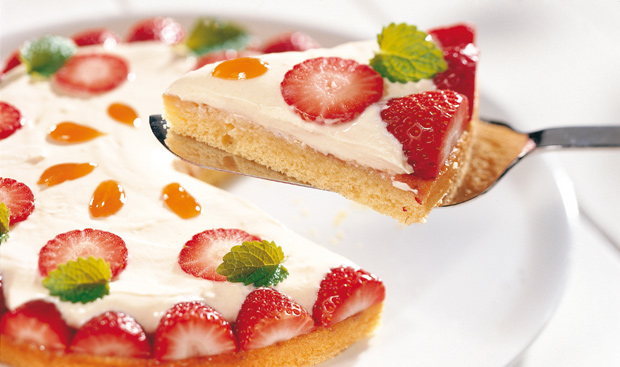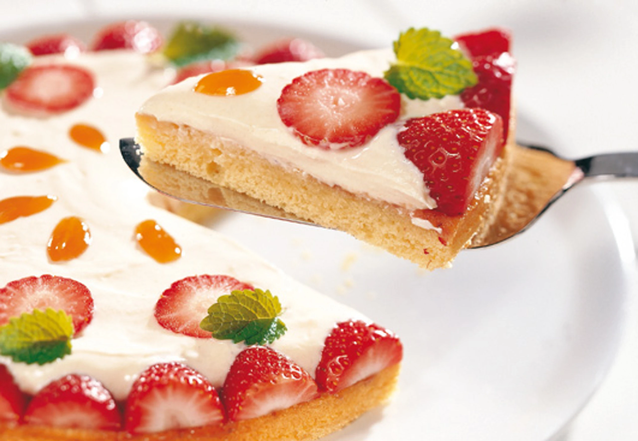 Biskuit-Torte mit Topfencreme und Erdbeeren