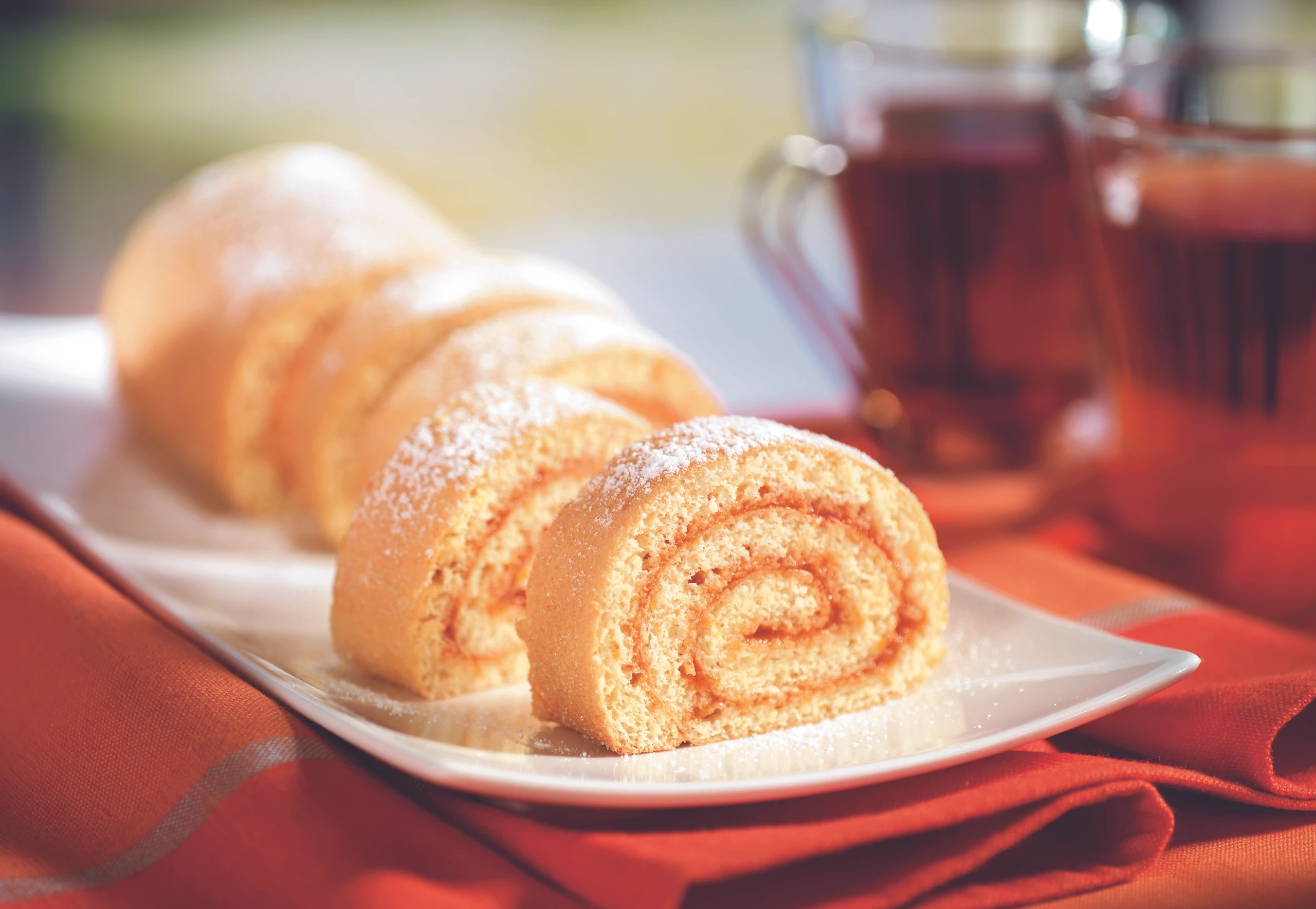 Marmelade mit Rum verrühren. Mitgebackenes Papier vom Biskuit abziehen. Biskuit mit der Marmelade bestreichen, straff einrollen, mit Staubzucker bestreuen und portionieren.