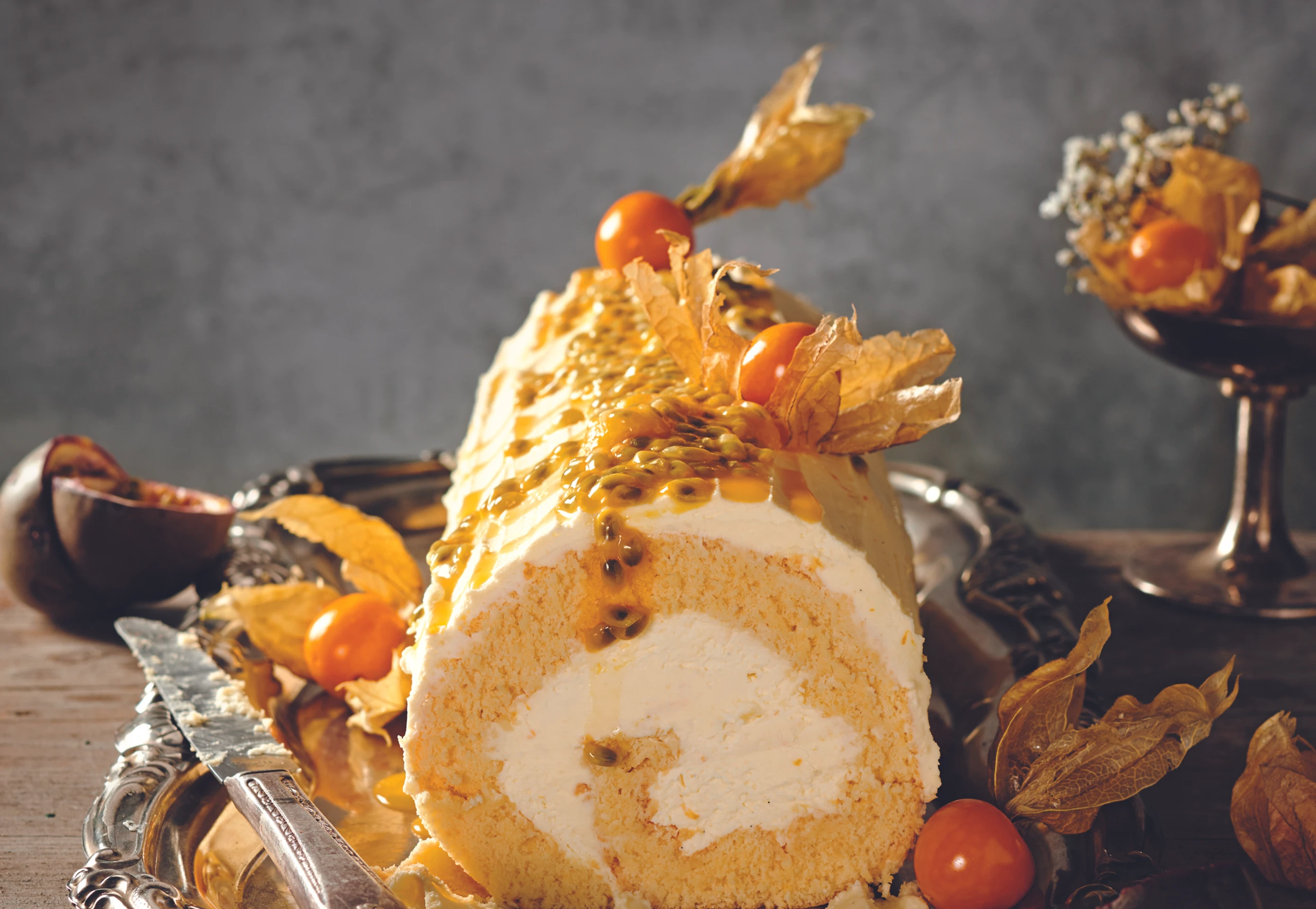 Maracujas halbieren, Fruchtfleisch herauslösen und auf der Roulade verteilen. Mit Physalis garnieren.