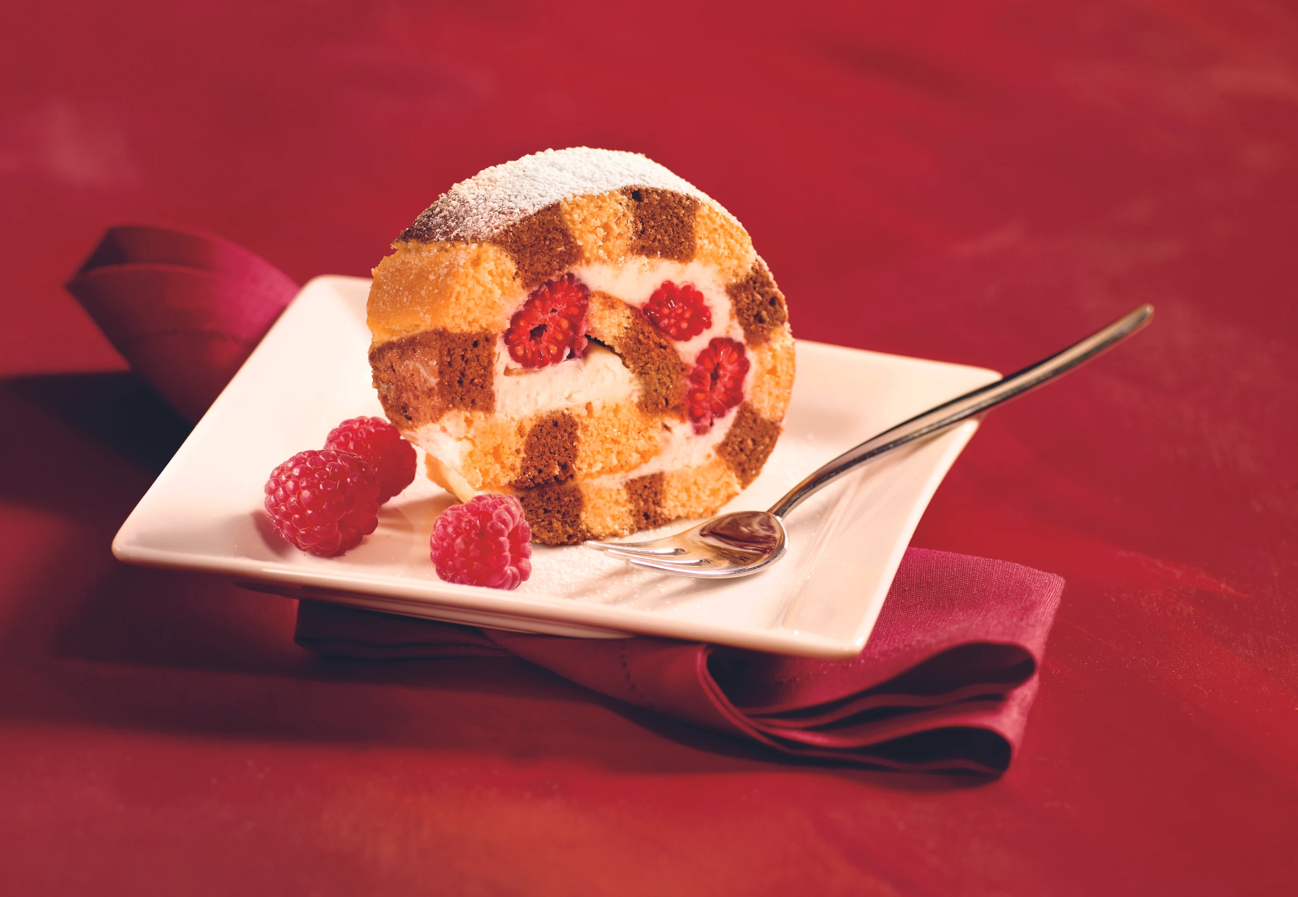 Biskuit straff einrollen und in Backpapier wickeln. Roulade mit der Verschlussseite nach unten auf eine Platte legen und für 1 Stunde kühl stellen.