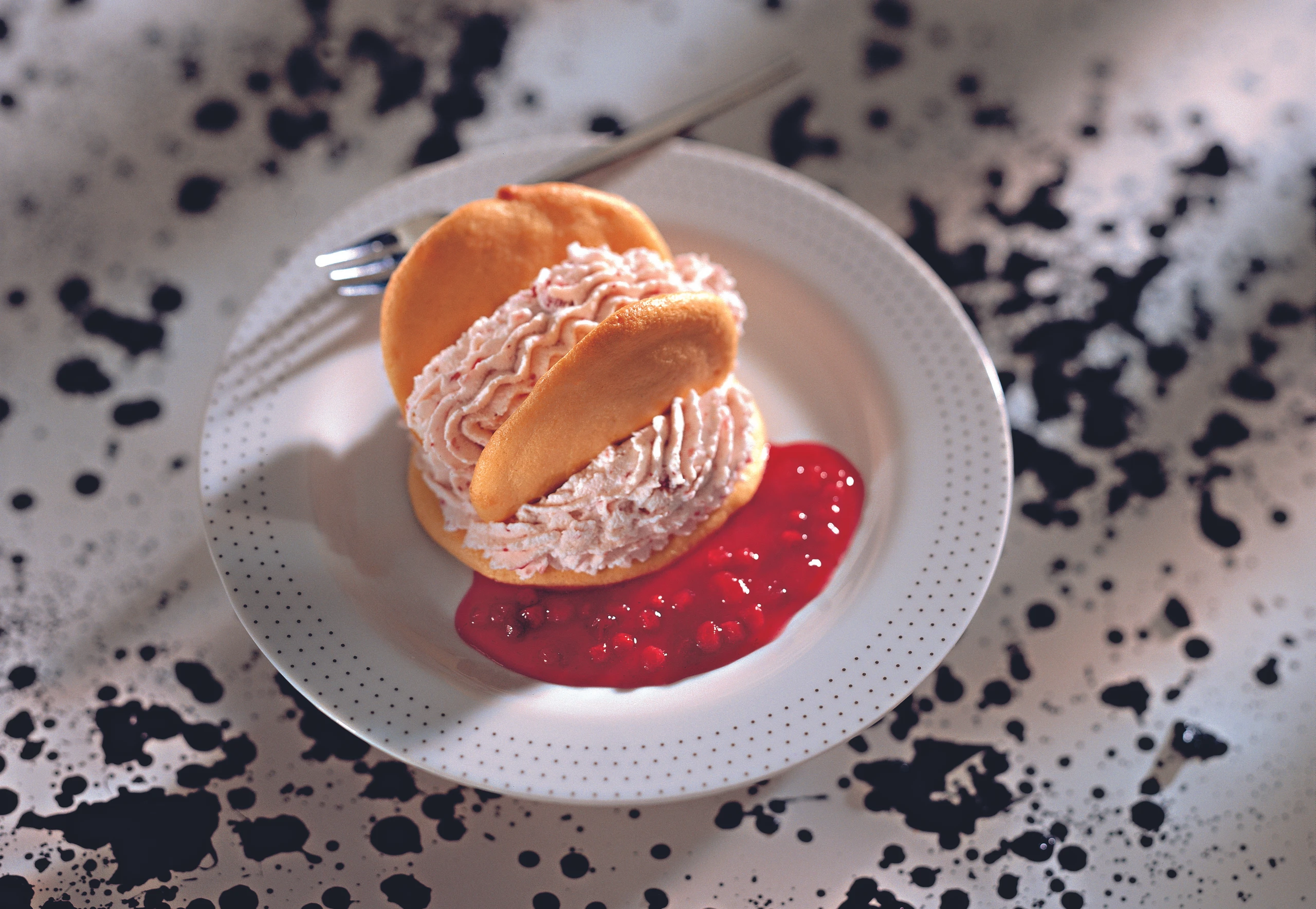 Die Preiselbeercreme in einen Dressiersack mit Sterntülle füllen und auf 4 von den Biskuitscheiben dressieren. Die restlichen Biskuitscheiben halbieren, je zwei Hälften auf jedes Törtchen setzen. Biskuittörtchen mit der Preiselbeer-Sauce (siehe Rezept) anrichten.