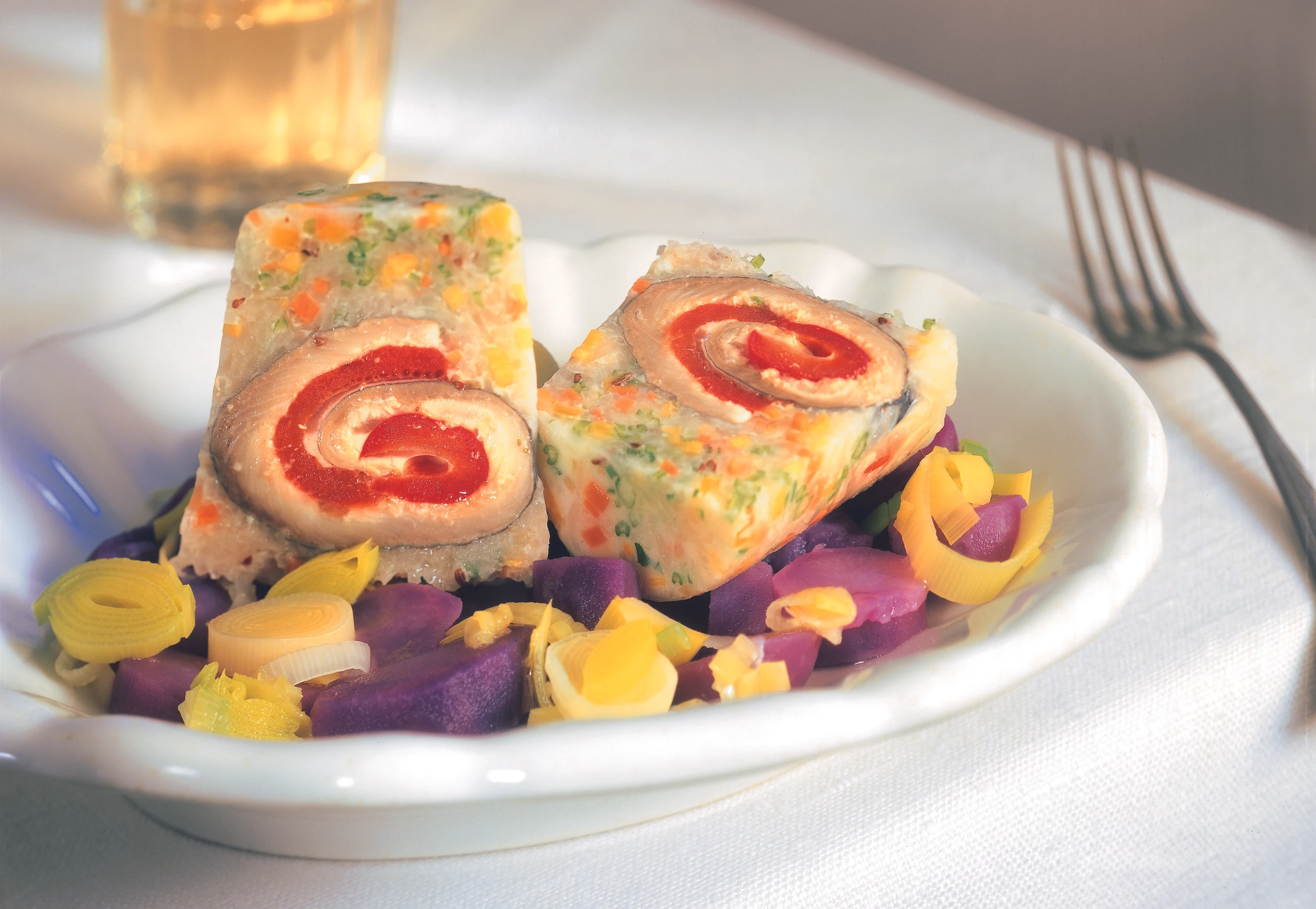 Förmchen zwei Drittel hoch mit der Gemüsemischung füllen, die Heringsröllchen hinein legen und behutsam in die Masse drücken. Förmchen mit übriger Gemüsemischung und Flüssigkeit auffüllen. Förmchen mit Frischhaltefolie zudecken und für ca. 3 Stunden kalt stellen.