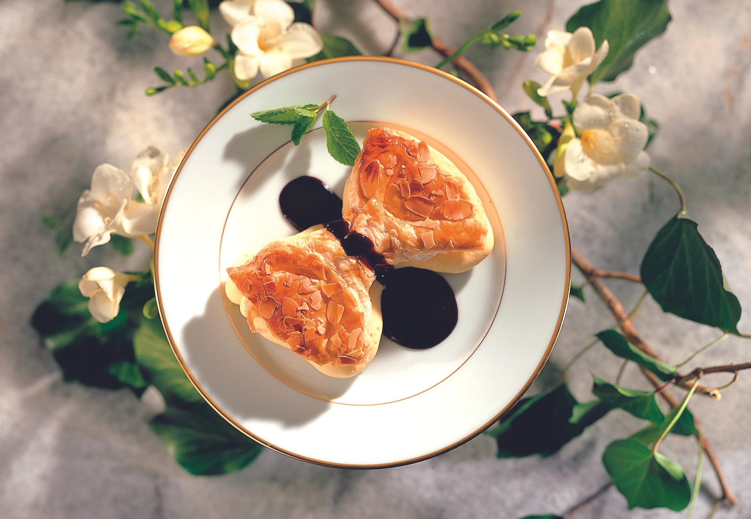 Blätterteig-Mascherl mit Orangencreme und Schokosauce