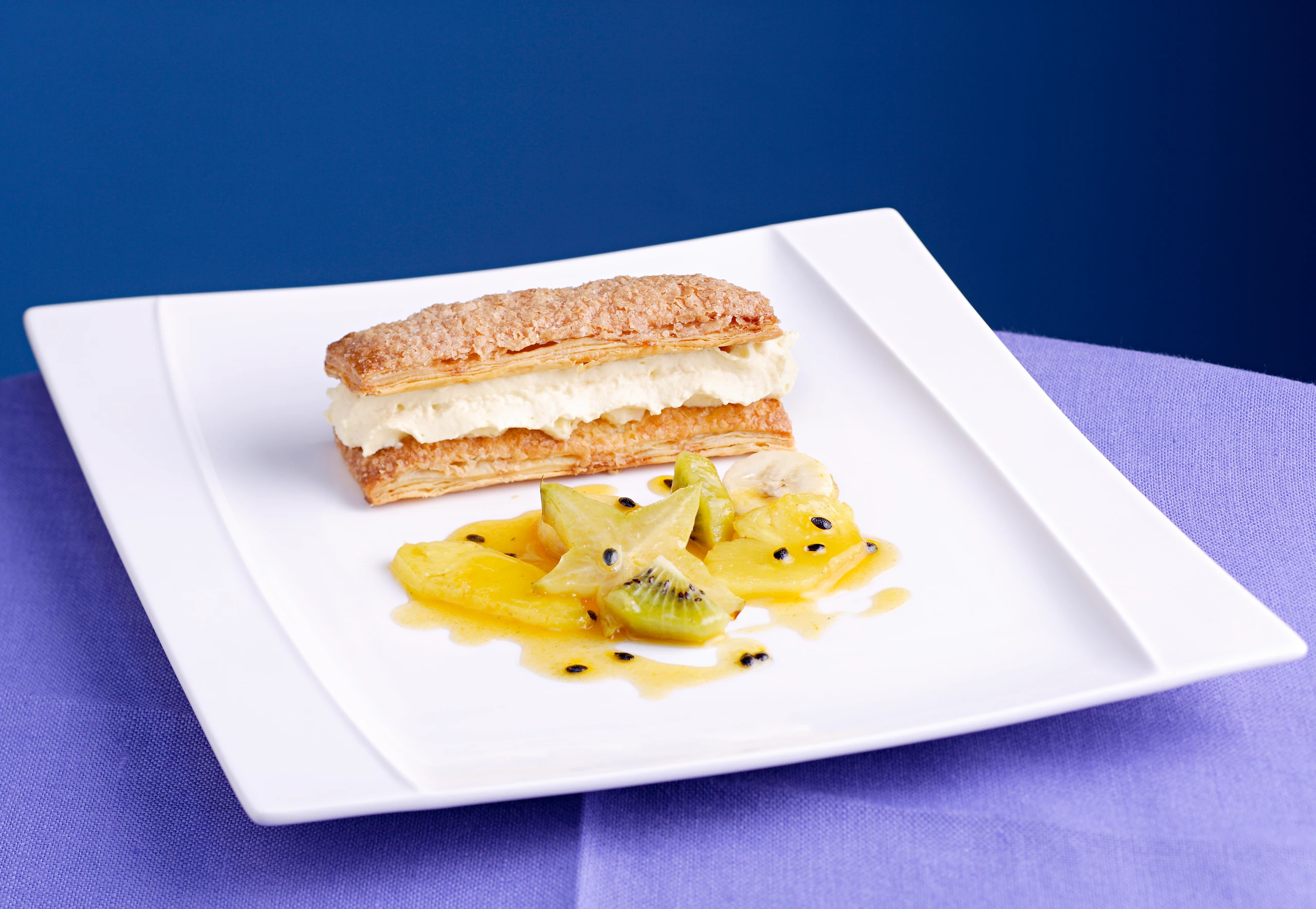 Blätterteigschnitten mit Karamellcreme und Früchten