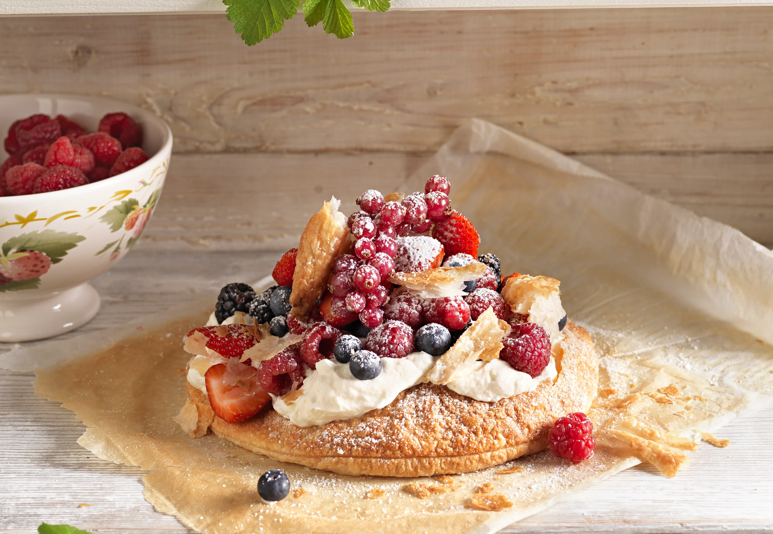 Blätterteig aufrollen und das Papier abziehen. Teig ausrollen (42 x 25 cm) und eine Scheibe (Ø ca. 24 cm) ausstechen. Teigreste längs zusammenfalten. Teigscheibe und Teigreste auf das Blech legen, mit Staubzucker bestreuen und im Rohr (mittlere Schiene) ca. 25 Minuten backen. Herausnehmen und auskühlen lassen.