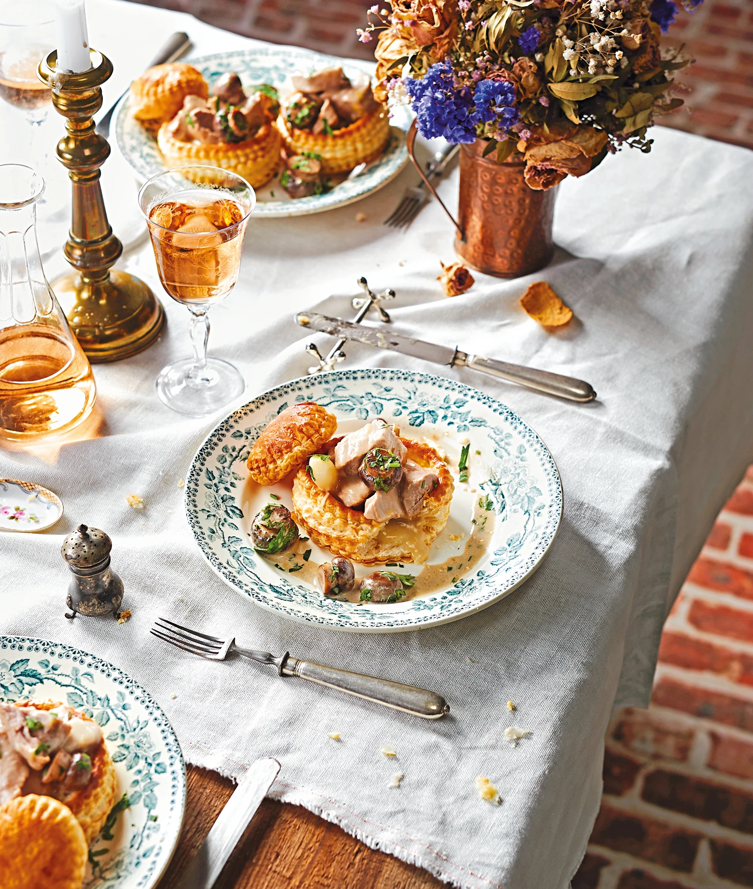 Blanquette de veau in die Vol-au-vents füllen und mit den Champignons servieren. Mit übriger Petersilie bestreuen.