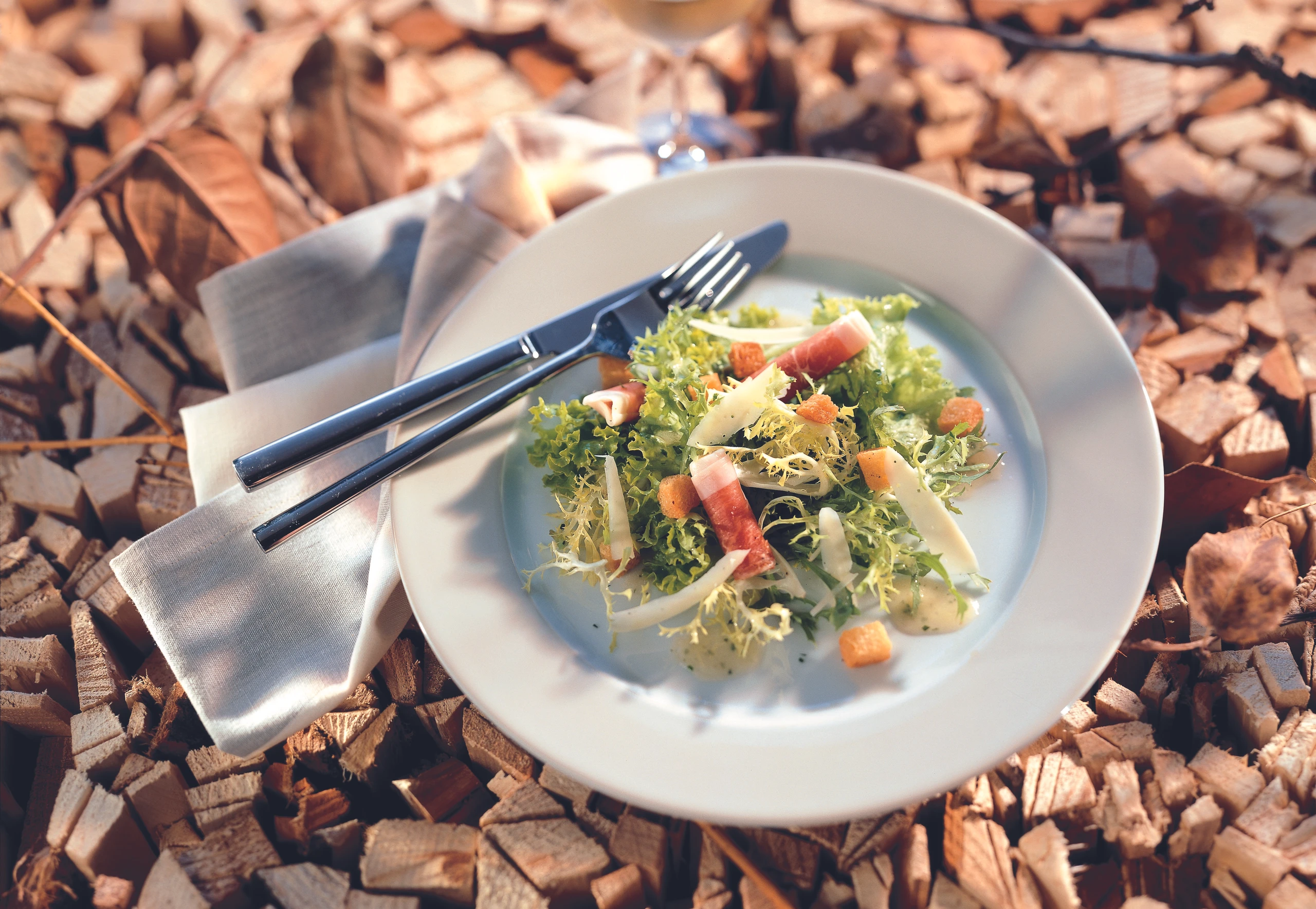Blattsalat mit Rohschinken, Parmesan und Croûtons