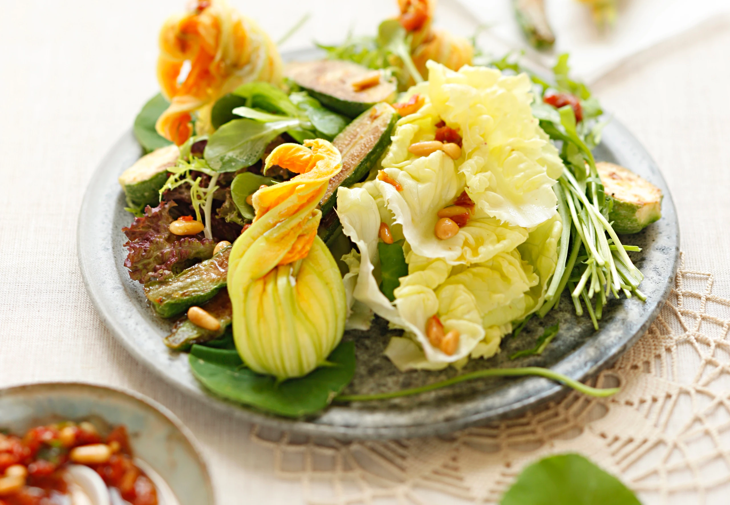 Blattsalate mit der Vinaigrette vermischen, mit den gebratenen Zucchini und den Blüten anrichten.