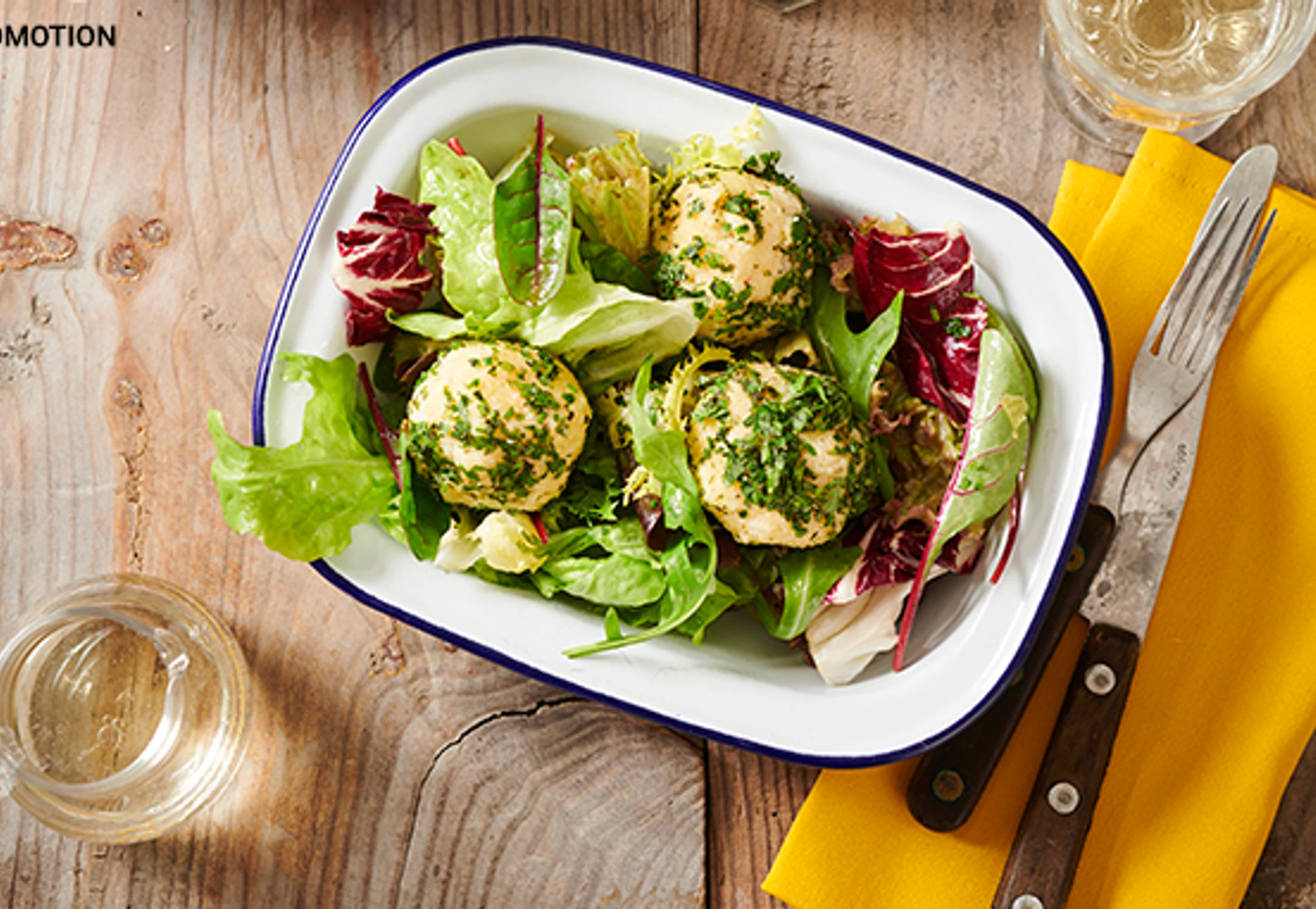 Blattsalate mit Käse-Topfenknödeln und Kräutern