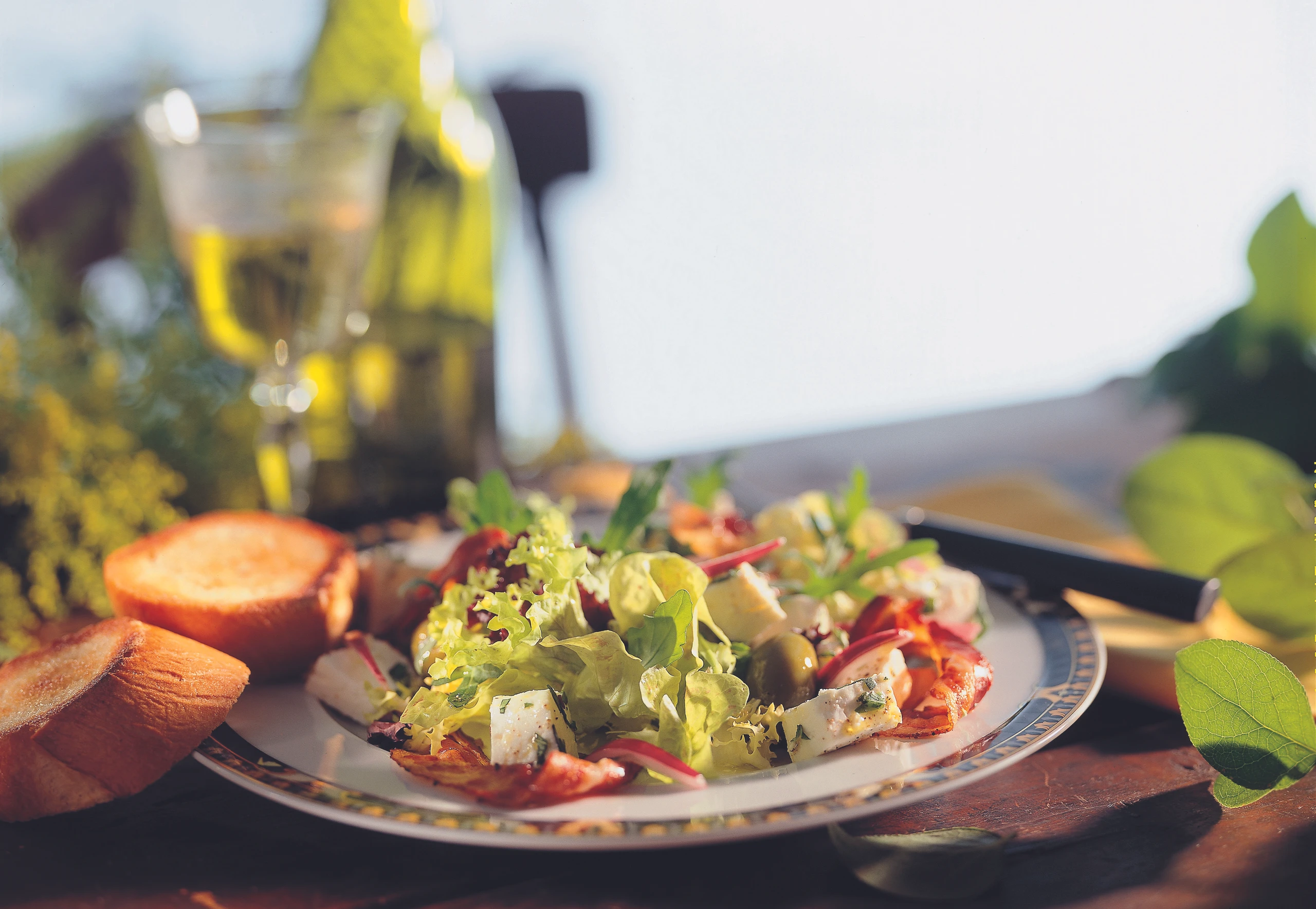 Salate mit der Marinade vermischen, auf Tellern anrichten und mit Speck, Käse, Oliven und Zwiebelscheiben servieren. Dazu passt Knoblauch-Baguette (siehe Rezept).
