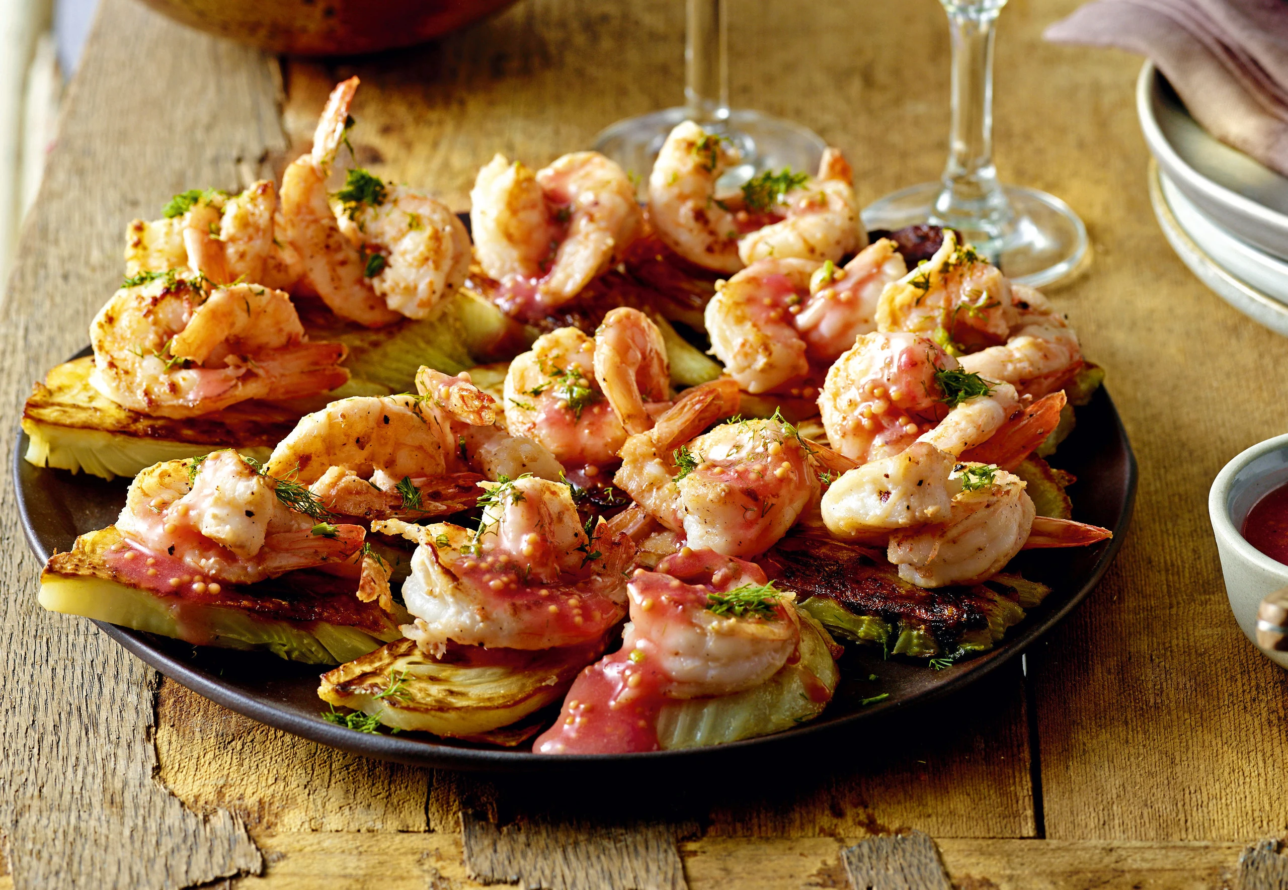 Fenchel mit den Garnelen anrichten, mit Fenchelgrün bestreuen und mit Sauce und Salat servieren.