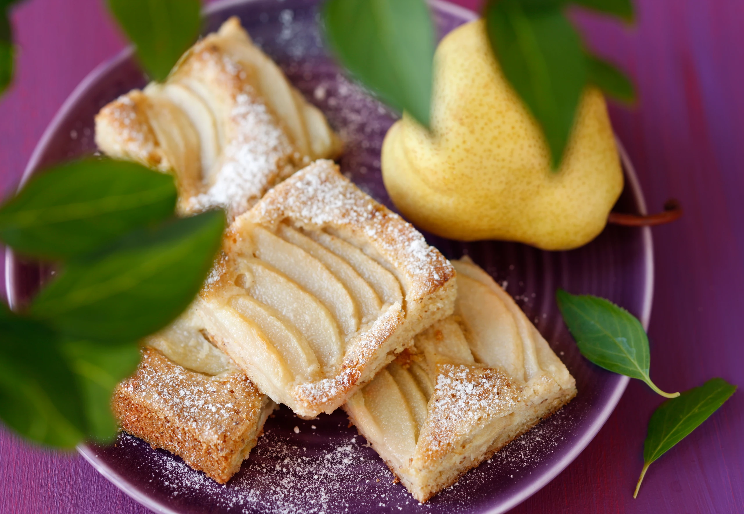 Masse gleichmäßig auf dem Blech verstreichen. Birnen in Streifen schneiden und die Masse damit belegen. Zitrone auspressen, Saft über die Birnen träufeln. Kuchen im Rohr (mittlere Schiene) ca. 45 Minuten backen.