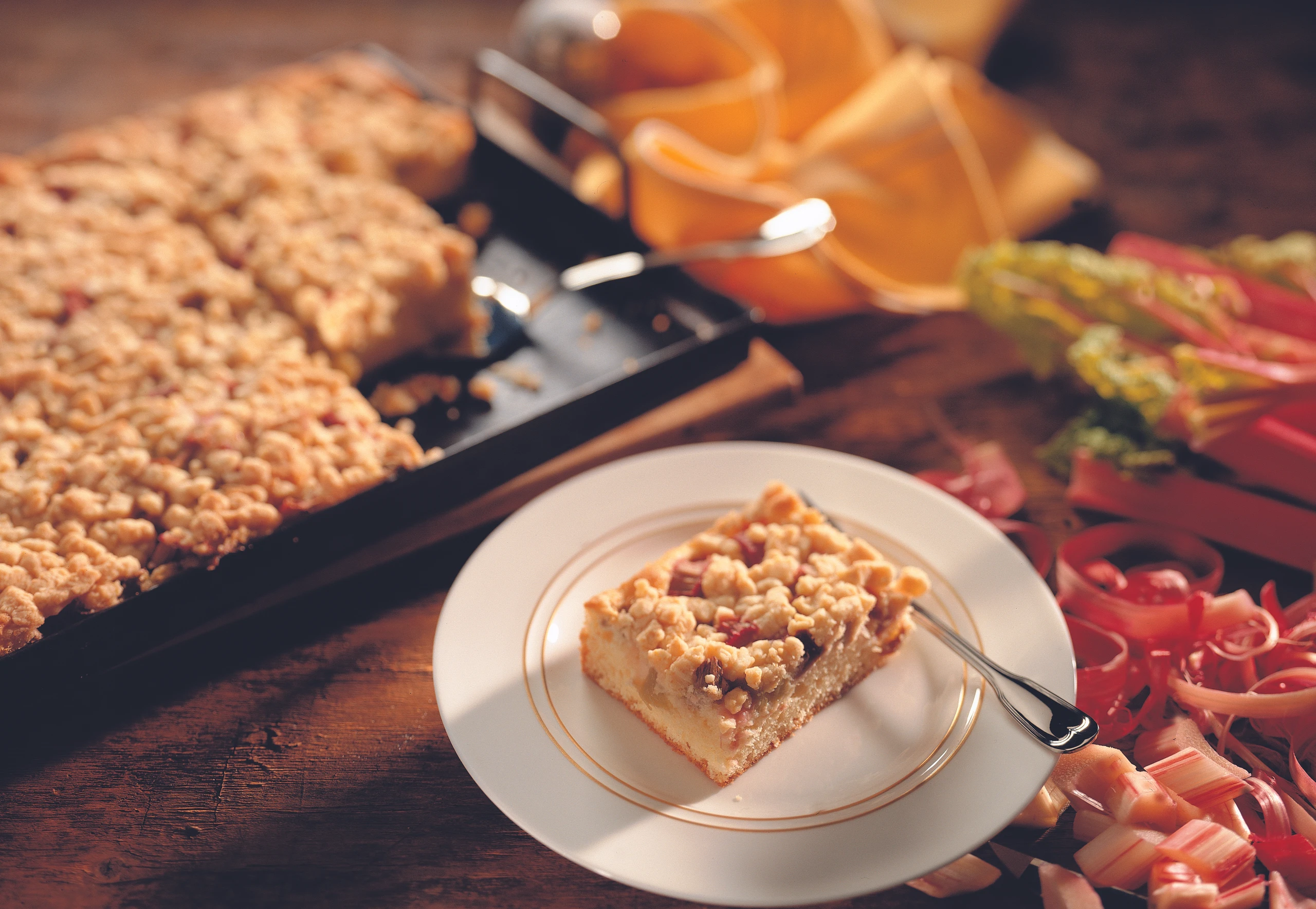Teig auf das Backblech streichen, gleichmäßig mit Rhabarber belegen und mit Streusel bestreuen. Kuchen 55–60 Minuten (mittlere Schiene) backen. Kuchen auskühlen lassen, mit Staubzucker bestreuen und in Stücke schneiden.