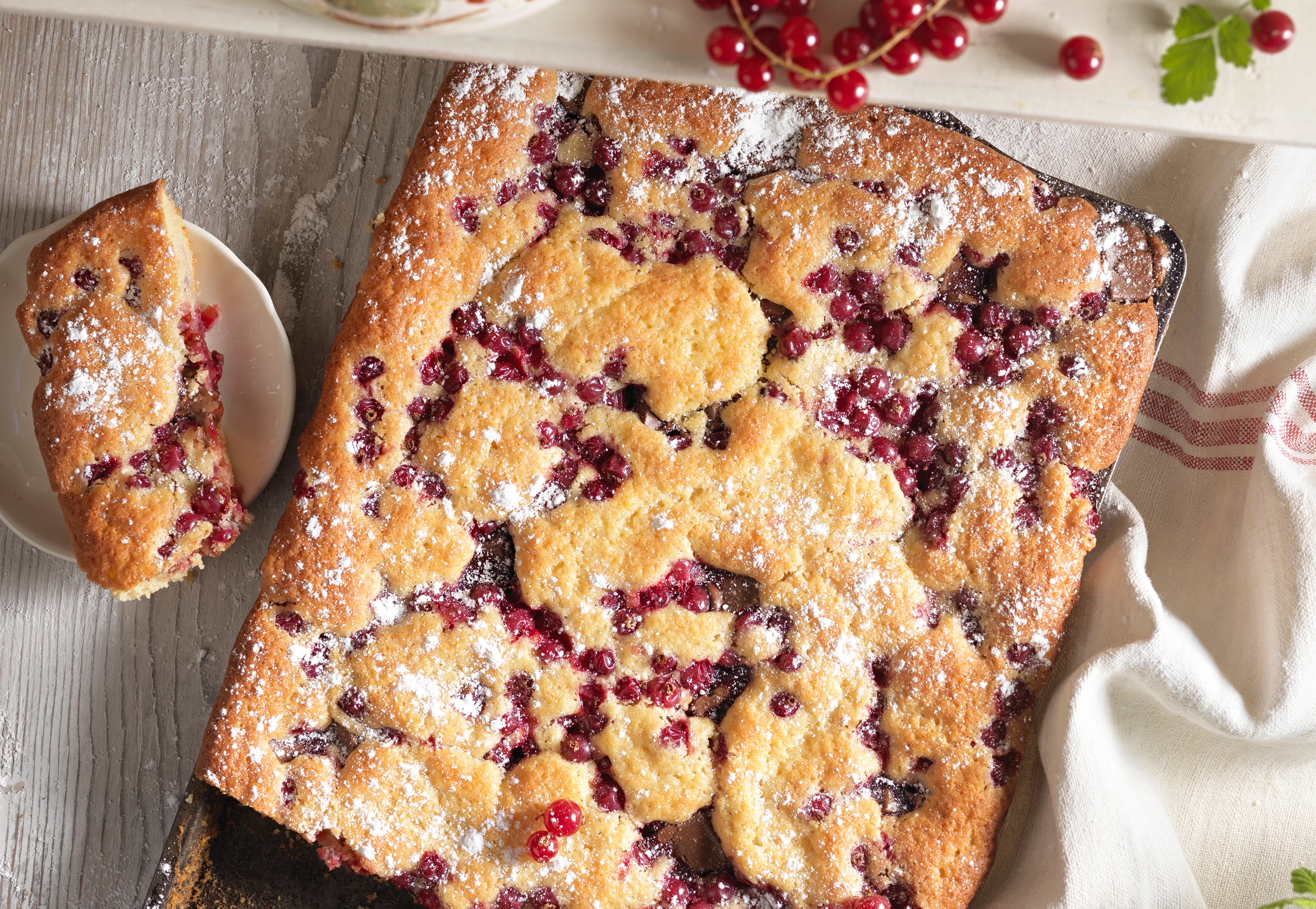 Kuchenmasse gleichmäßig auf dem Blech verstreichen und mit Ribiseln und Nougat bestreuen. Kuchen im Rohr (mittlere Schiene) ca. 35 Minuten backen. Kuchen herausnehmen und mit Staubzucker bestreut servieren.