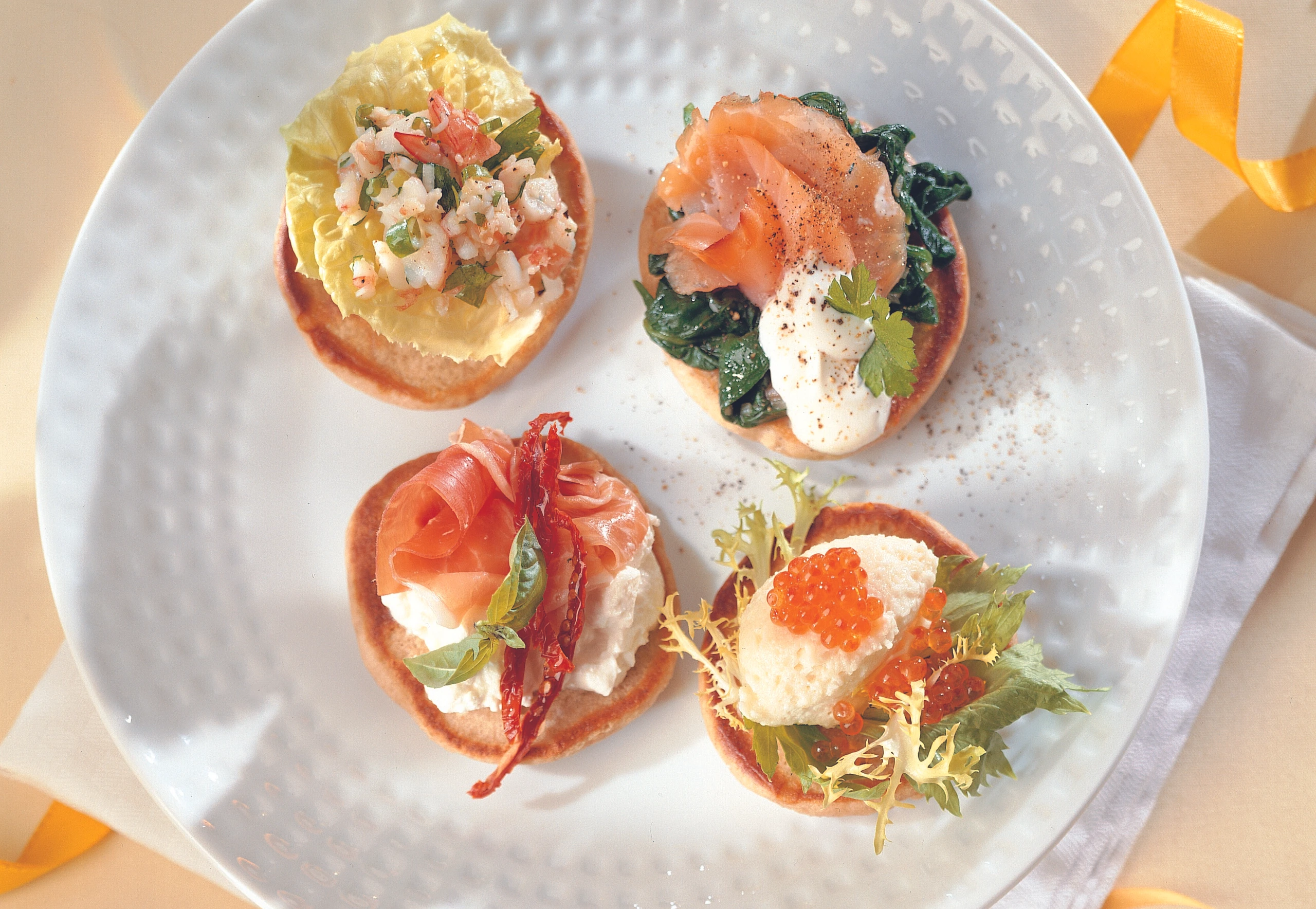 - Blinis mit Spinat und Lachs belegen, einen Tupfer Rahm darauf geben. Mit Petersilie garnieren.